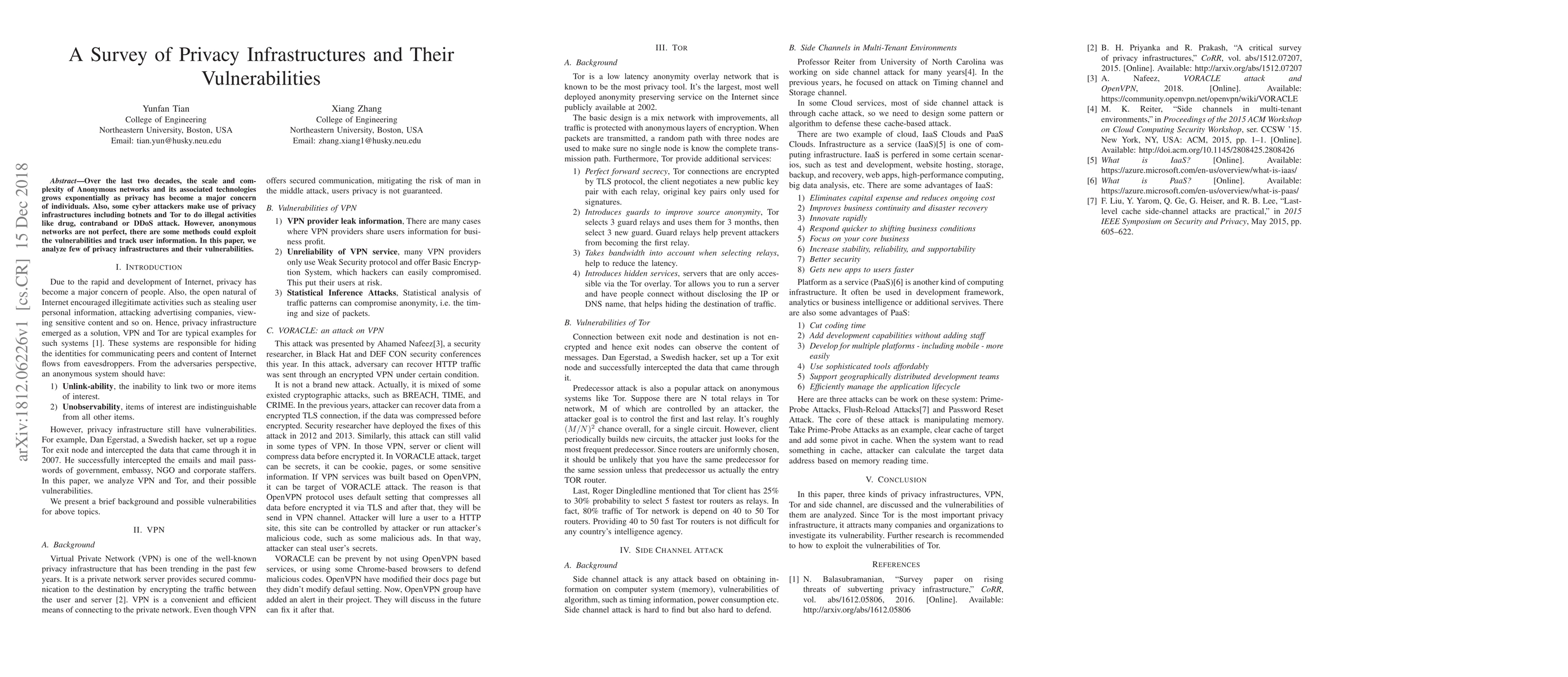 Over the last two decades, the scale and complexity of Anonymous networks and its associated technologies grows exponentially as privacy has become a major concern of individuals. Also, some cyber attackers make use of privacy infrastructures including botnets and Tor to do illegal activities like drug, contraband or DDoS attack. However, anonymous networks are not perfect, there are some methods could exploit the vulnerabilities and track user information. In this paper, we analyze few of privacy infrastructures and their vulnerabilities.