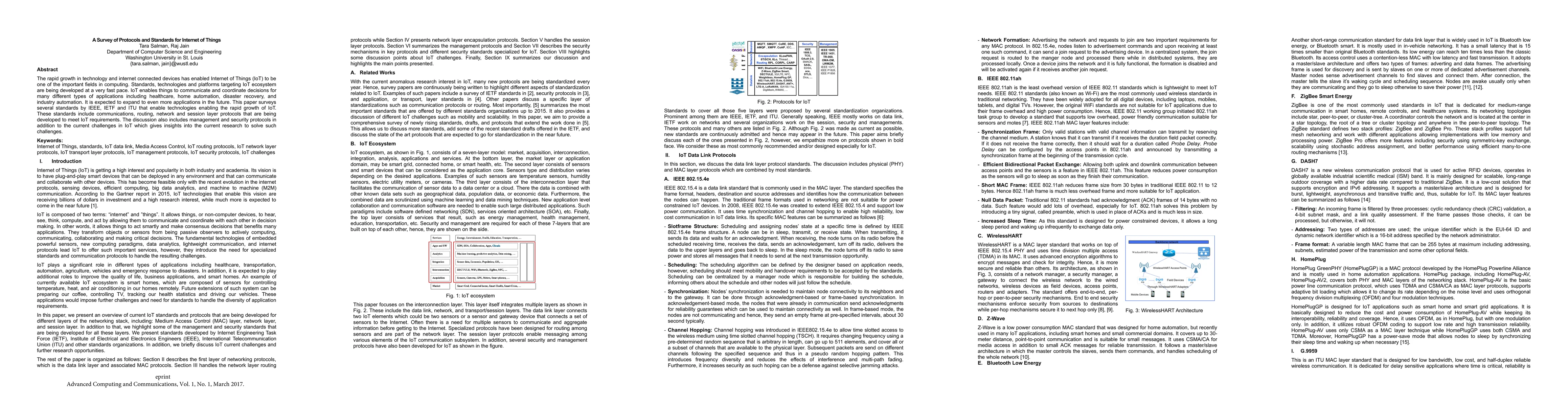 The rapid growth in technology and internet connected devices has enabled Internet of Things (IoT) to be one of the important fields in computing. Standards, technologies and platforms targeting IoT ecosystem are being developed at a very fast pace. IoT enables things to communicate and coordinate decisions for many different types of applications including healthcare, home automation, disaster recovery, and industry automation. It is expected to expand to even more applications in the future. This paper surveys several standards by IEEE, IETF and ITU that enable technologies enabling the rapid growth of IoT. These standards include communications, routing, network and session layer protocols that are being developed to meet IoT requirements. The discussion also includes management and security protocols in addition to the current challenges in IoT which gives insights into the current research to solve such challenges.