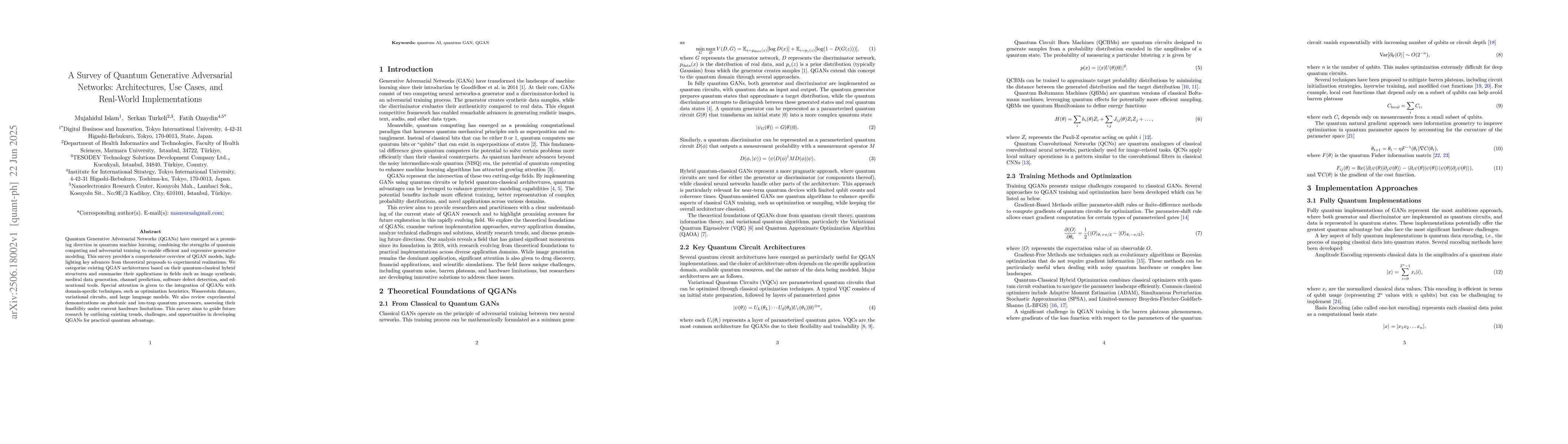 Quantum Generative Adversarial Networks (QGANs) have emerged as a promising direction in quantum machine learning, combining the strengths of quantum computing and adversarial training to enable efficient and expressive generative modeling. This survey provides a comprehensive overview of QGAN models, highlighting key advances from theoretical proposals to experimental realizations. We categorize existing QGAN architectures based on their quantum-classical hybrid structures and summarize their applications in fields such as image synthesis, medical data generation, channel prediction, software defect detection, and educational tools. Special attention is given to the integration of QGANs with domain-specific techniques, such as optimization heuristics, Wasserstein distance, variational circuits, and large language models. We also review experimental demonstrations on photonic and ion-trap quantum processors, assessing their feasibility under current hardware limitations. This survey aims to guide future research by outlining existing trends, challenges, and opportunities in developing QGANs for practical quantum advantage.