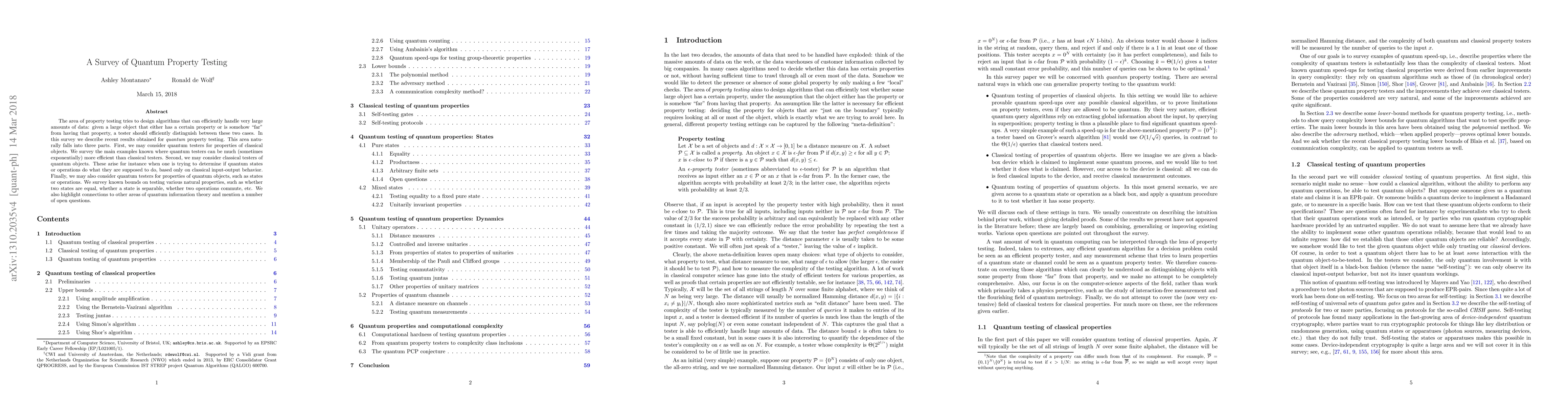 The paper provides a comprehensive survey of quantum property testing, covering three main areas: quantum testers for classical objects, classical testers for quantum objects, and quantum testers for quantum objects.