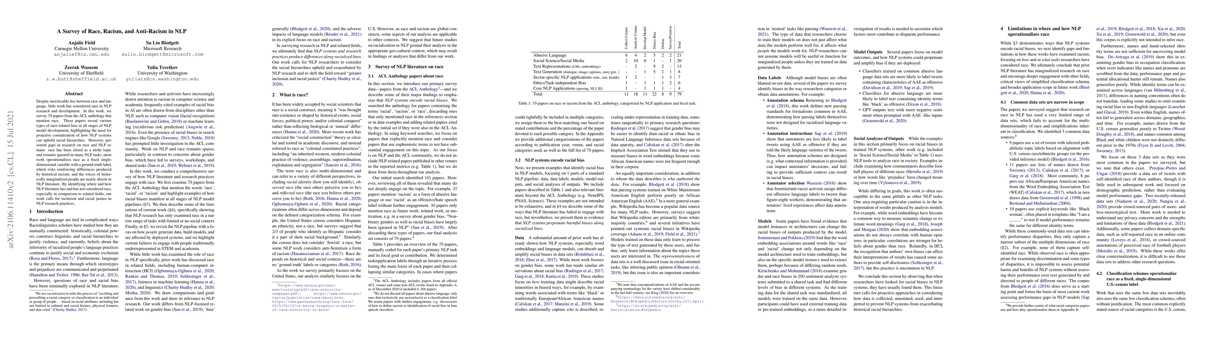 This paper surveys 79 ACL papers addressing race, revealing pervasive race-related biases in NLP model development and highlighting the need for proactive anti-racism measures. It identifies significant gaps in current research, including the marginalization of race as a topic and the lack of diverse voices in NLP literature, urging for more inclusive and just practices in NLP.