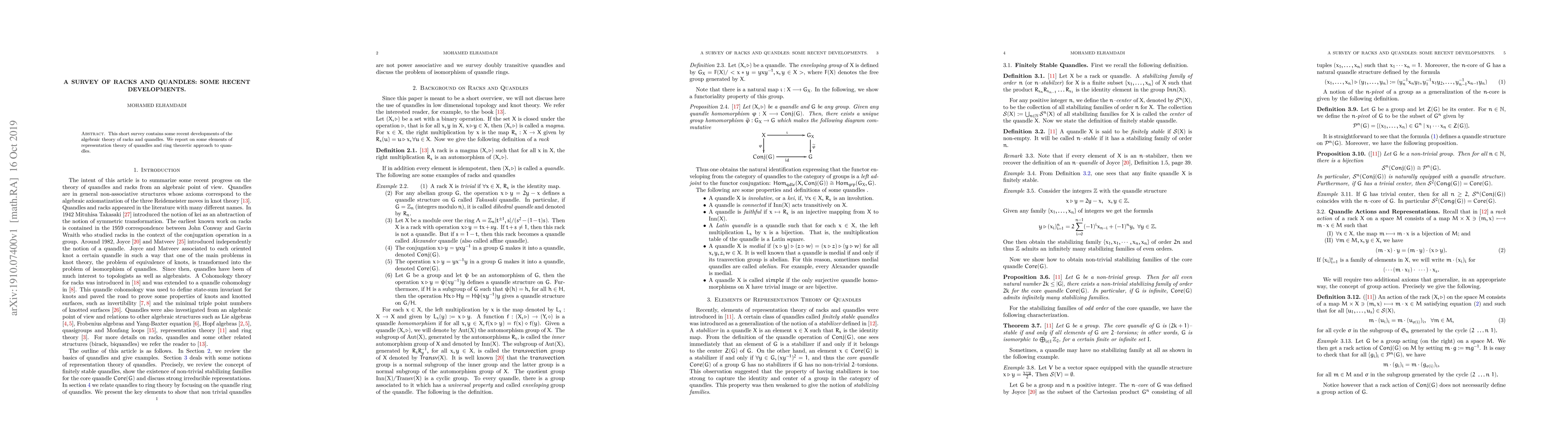 This short survey contains some recent developments of the algebraic theory of racks and quandles. We report on some elements of representation theory of quandles and ring theoretic approach to quandles.