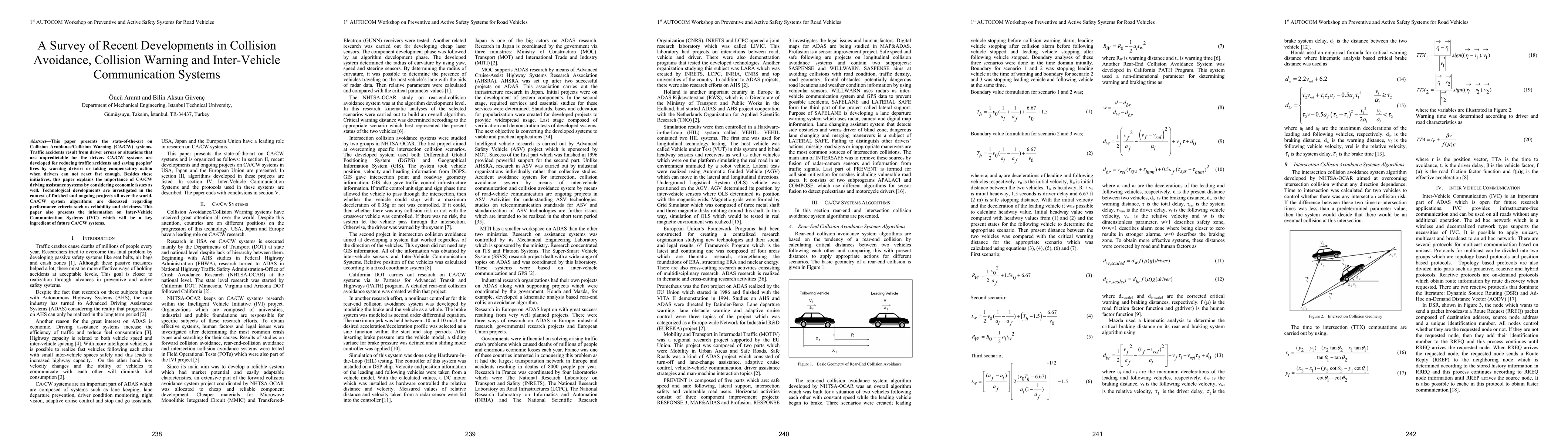 This paper presents the state-of-the-art on Collision Avoidance and Collision Warning (CA,CW) systems. Traffic accidents result from driver errors or situations that are unpredictable for the driver. CA,CW systems are developed for reducing traffic accidents and saving peoples lives by warning drivers or taking compensatory action when drivers can not react fast enough. Besides these initiatives, this paper explains the importance of CA,CW driving assistance systems by considering economic issues as well. Technological developments are investigated in the context of finished and ongoing projects all over the world. CA,CW system algorithms are discussed regarding performance criteria such as reliability and strictness. This paper also presents the information on Inter-Vehicle Communication Systems (IVC) which will be a key ingredient of future CA,CW systems.