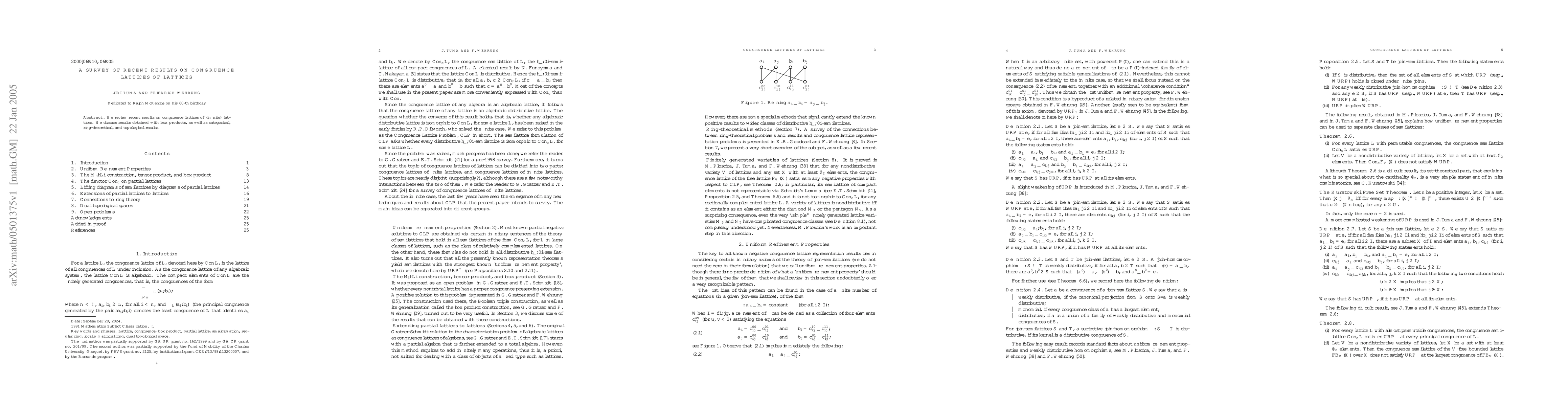 We review recent results on congruence lattices of (infinite) lattices. We discuss results obtained with box products, as well as categorical, ring-theoretical, and topological results.