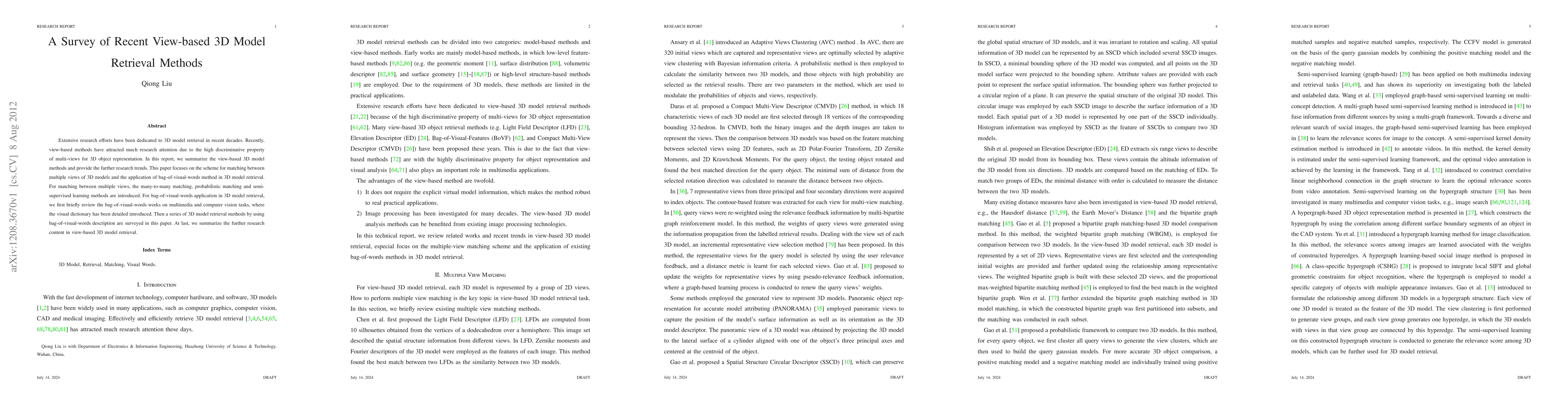 This paper surveys recent advancements in view-based 3D model retrieval methods, focusing on multiple view matching techniques and the application of the bag-of-visual-words approach. It highlights trends and future research directions in this field.