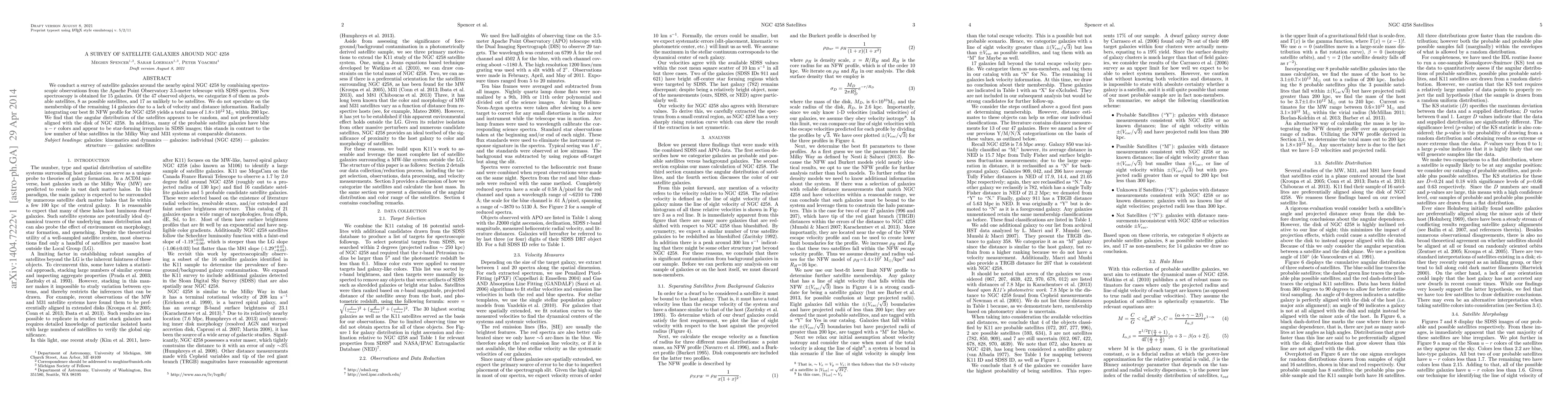 The survey of satellite galaxies around NGC 4258 identified 8 probable and 8 possible satellites among 47 observed objects. The satellites show blue colors and are star-forming irregulars, contrasting with fewer blue satellites around the Milky Way and M31. The distribution of these satellites is random, not aligned with NGC 4258's disk, and the total mass within 200 kpc of NGC 4258 is estimated at 1.8e12 Msun.