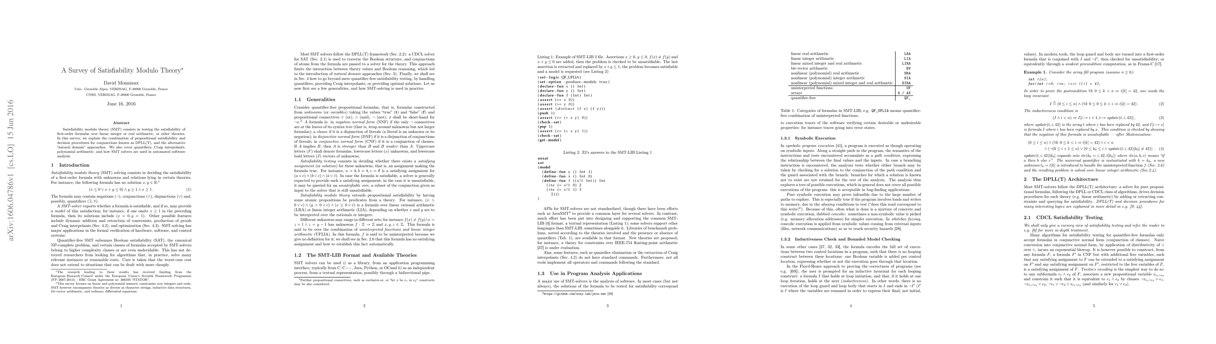 This survey explores satisfiability modulo theory (SMT), detailing the DPLL(T) approach and alternative methods, and discusses applications in automated software analysis, including the use of quantifiers, Craig interpolants, and polynomial arithmetic.