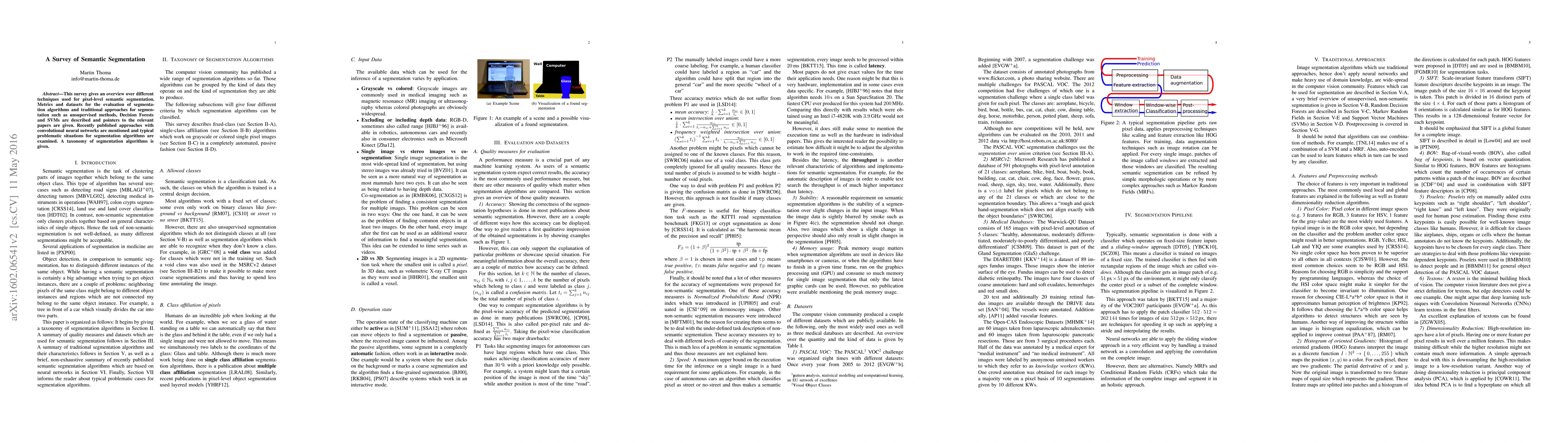 This survey provides an overview of various techniques for pixel-level semantic segmentation, including traditional methods like unsupervised approaches, Decision Forests, and SVMs, as well as recent advancements using convolutional neural networks. It also discusses evaluation metrics and datasets, problematic situations, and presents a taxonomy of segmentation algorithms.