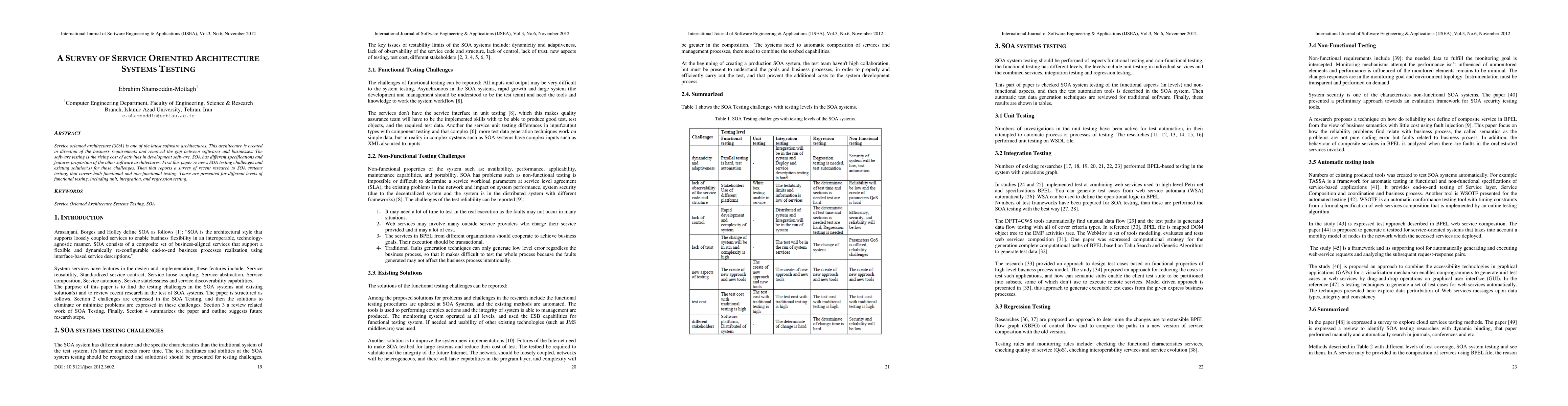 This paper reviews challenges in testing Service Oriented Architecture (SOA) systems and existing solutions, followed by a survey of recent research on both functional and non-functional testing at various levels, including unit, integration, and regression testing.