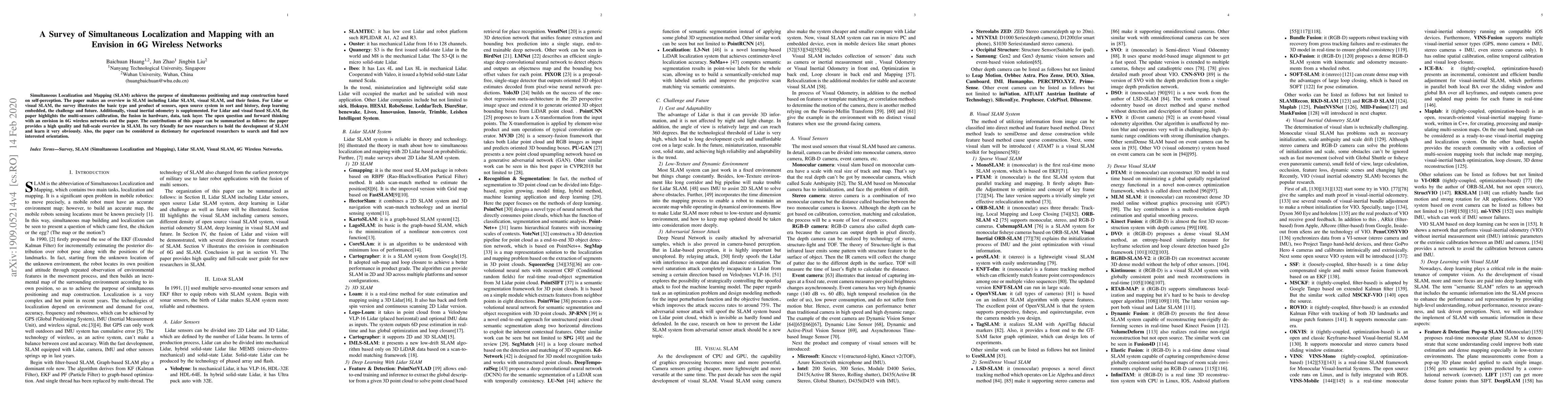 Simultaneous Localization and Mapping (SLAM) achieves the purpose of simultaneous positioning and map construction based on self-perception. The paper makes an overview in SLAM including Lidar SLAM, visual SLAM, and their fusion. For Lidar or visual SLAM, the survey illustrates the basic type and product of sensors, open source system in sort and history, deep learning embedded, the challenge and future. Additionally, visual inertial odometry is supplemented. For Lidar and visual fused SLAM, the paper highlights the multi-sensors calibration, the fusion in hardware, data, task layer. The open question and forward thinking with an envision in 6G wireless networks end the paper. The contributions of this paper can be summarized as follows: the paper provides a high quality and full-scale overview in SLAM. It's very friendly for new researchers to hold the development of SLAM and learn it very obviously. Also, the paper can be considered as a dictionary for experienced researchers to search and find new interesting orientation.