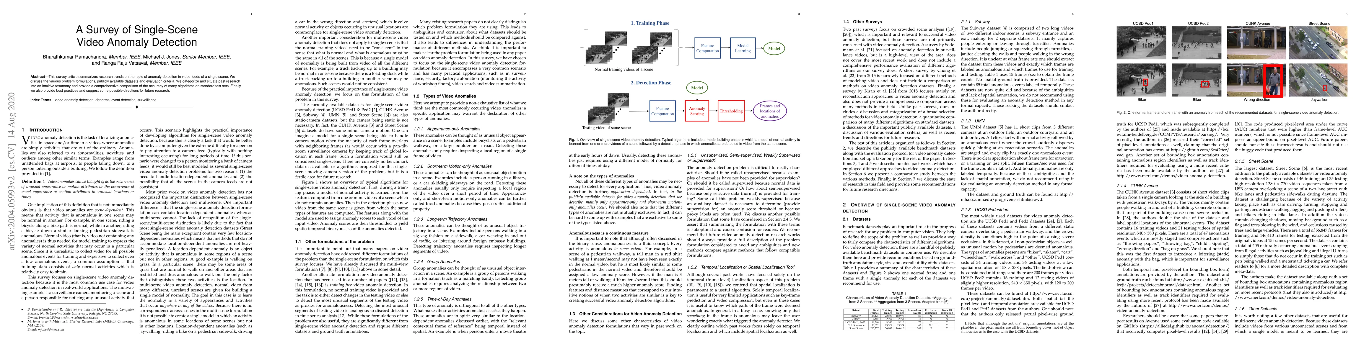This survey article reviews trends in single-scene video anomaly detection, categorizing past research and comparing algorithm accuracies on standard datasets. It also outlines best practices and proposes future research directions.