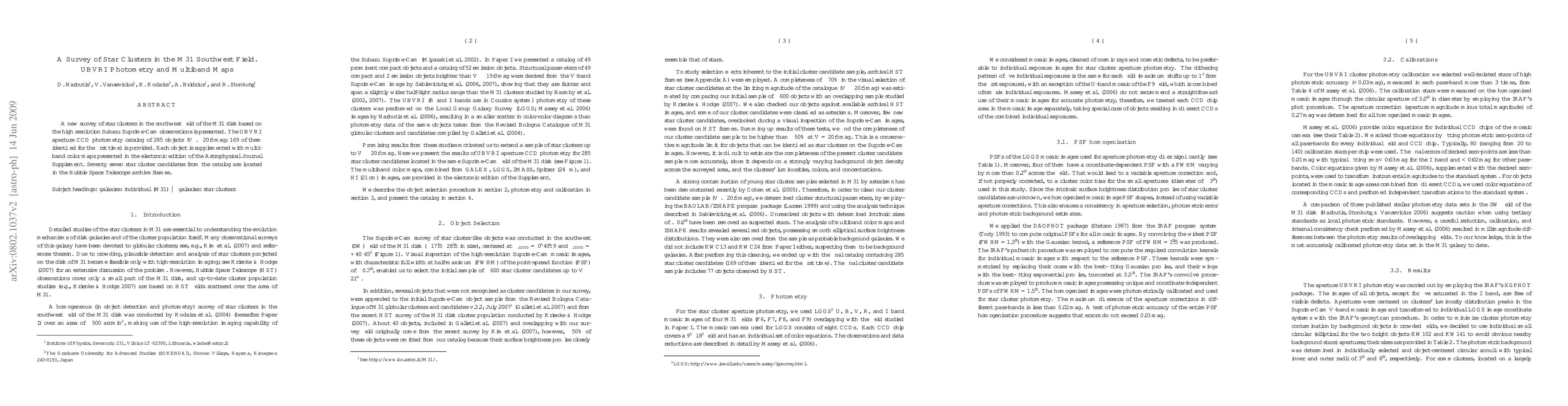 A new survey of star clusters in the South-West field of the M31 disk based on the high resolution Subaru Suprime-Cam observations is presented. The UBVRI aperture CCD photometry catalog of 285 objects (V < 20.5; 169 of them identified for the first time) is provided. Each object is supplemented with multi-band color maps presented in the electronic edition of the Astrophysical Journal Supplement. Seventy seven star cluster candidates from the catalog are located in the Hubble Space Telescope archive frames.