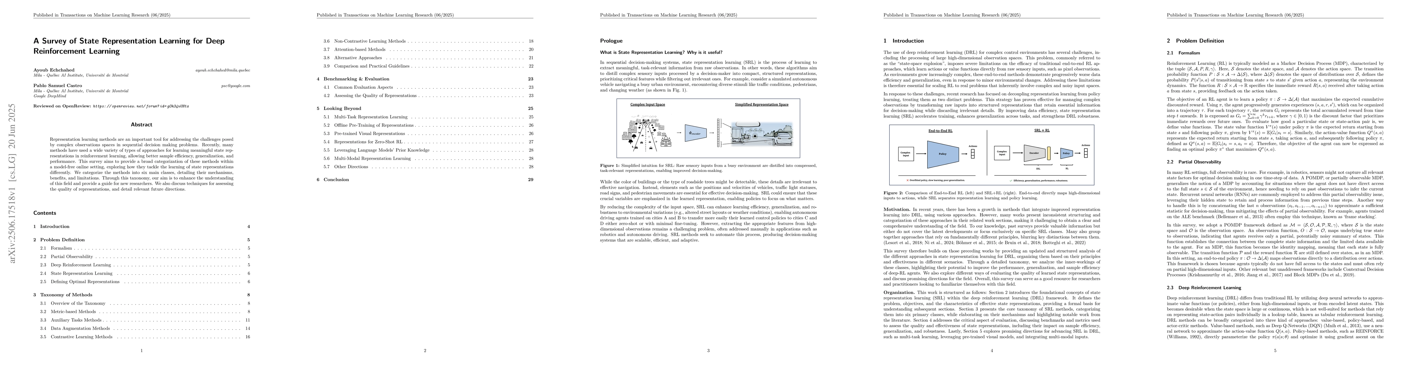 This survey categorizes state representation learning methods for deep reinforcement learning into six main classes, detailing their mechanisms, benefits, and limitations. It aims to improve understanding and guide future research in this field, also discussing representation quality assessment techniques.