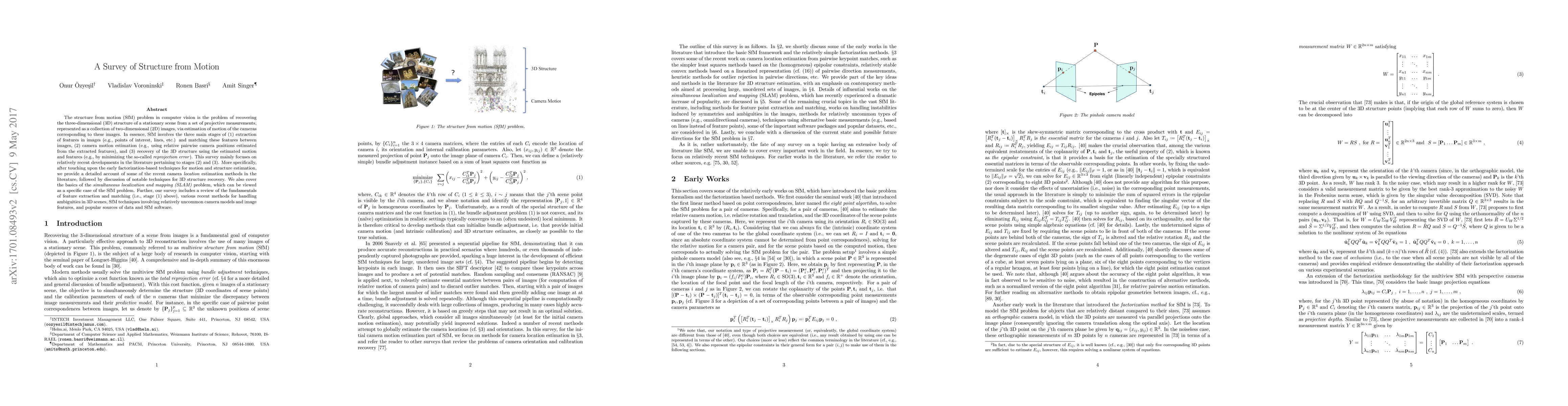 This paper surveys the structure from motion (SfM) problem in computer vision, focusing on recent advancements in camera motion and 3D structure estimation. It covers foundational techniques, recent camera location methods, 3D structure recovery, and the relationship between SfM and SLAM, while also touching on feature extraction, handling ambiguities, and various camera models.