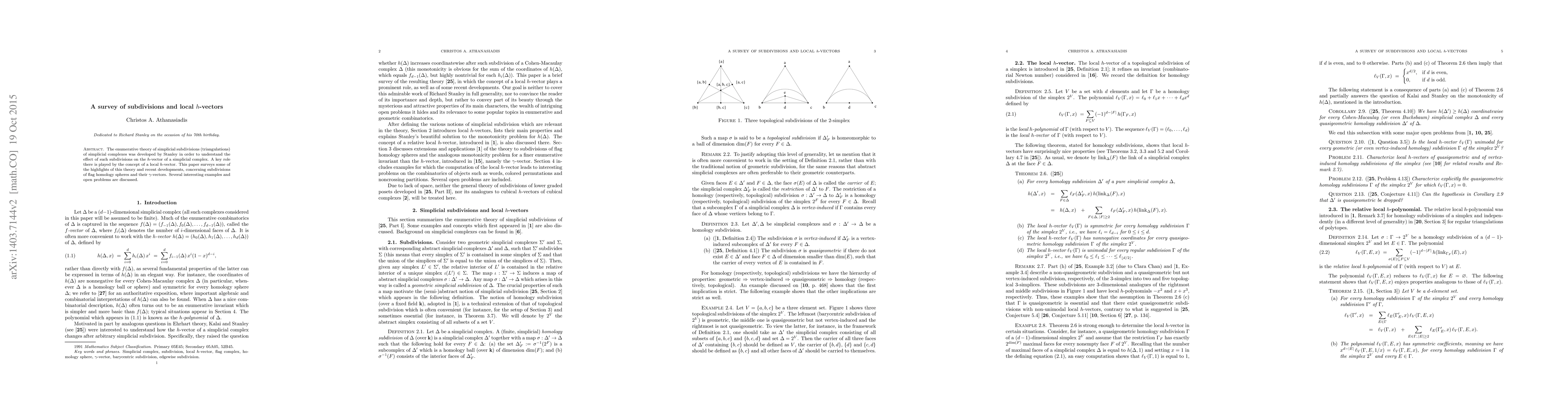 The enumerative theory of simplicial subdivisions (triangulations) of simplicial complexes was developed by Stanley in order to understand the effect of such subdivisions on the $h$-vector of a simplicial complex. A key role there is played by the concept of a local $h$-vector. This paper surveys some of the highlights of this theory and some recent developments, concerning subdivisions of flag homology spheres and their $\gamma$-vectors. Several interesting examples and open problems are discussed.