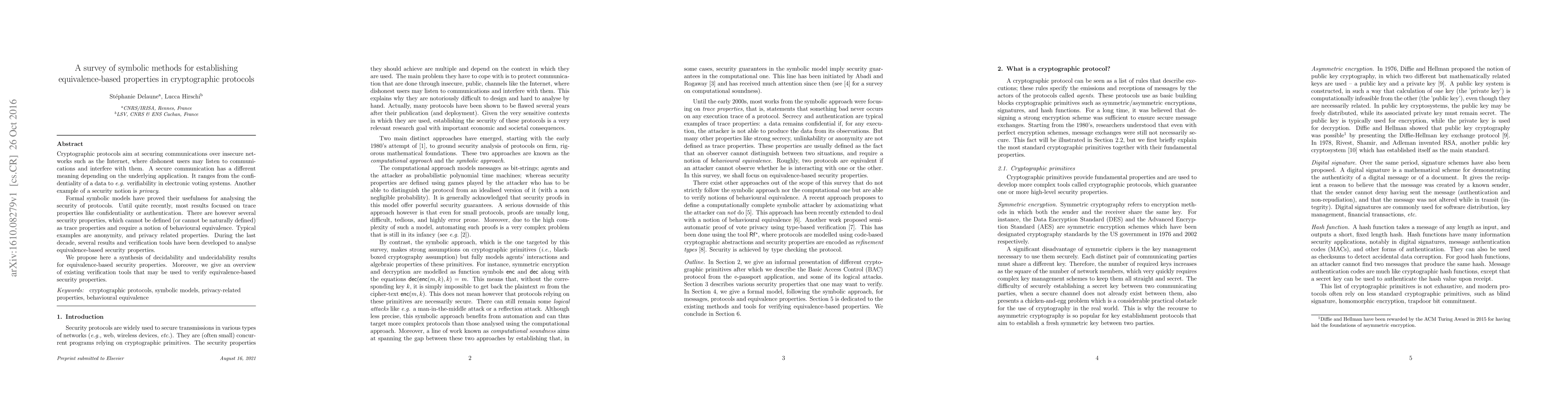 A survey of cryptographic protocols analyzes security properties that can't be defined as trace properties, focusing on equivalence-based security properties like anonymity and privacy. It provides an overview of existing verification tools to verify these properties.