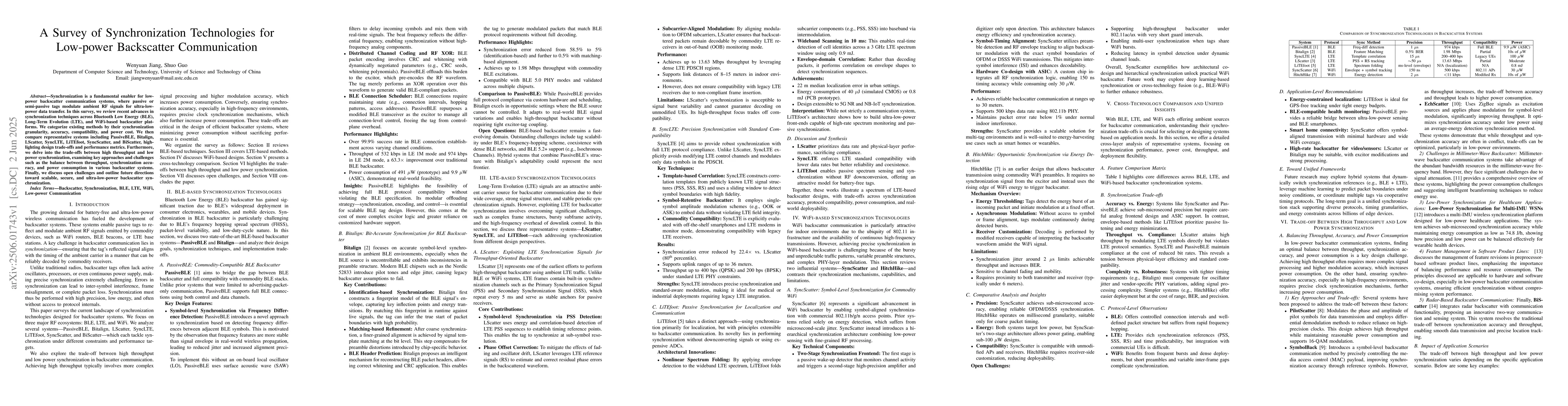 Synchronization is a fundamental enabler for low-power backscatter communication systems, where passive or semi-passive tags modulate ambient RF signals for ultra-low-power data transfer. In this survey, we review recent advances in synchronization techniques across Bluetooth Low Energy (BLE), Long-Term Evolution (LTE), and WiFi-based backscatter platforms. We categorize existing methods by their synchronization granularity, accuracy, compatibility, and power cost. We then compare representative systems including PassiveBLE, Bitalign, LScatter, SyncLTE, LiTEfoot, SyncScatter, and BiScatter, highlighting design trade-offs and performance metrics. Furthermore, we delve into the trade-offs between high throughput and low power synchronization, examining key approaches and challenges such as the balance between throughput, synchronization accuracy, and power consumption in various backscatter systems. Finally, we discuss open challenges and outline future directions toward scalable, secure, and ultra-low-power backscatter synchronization.