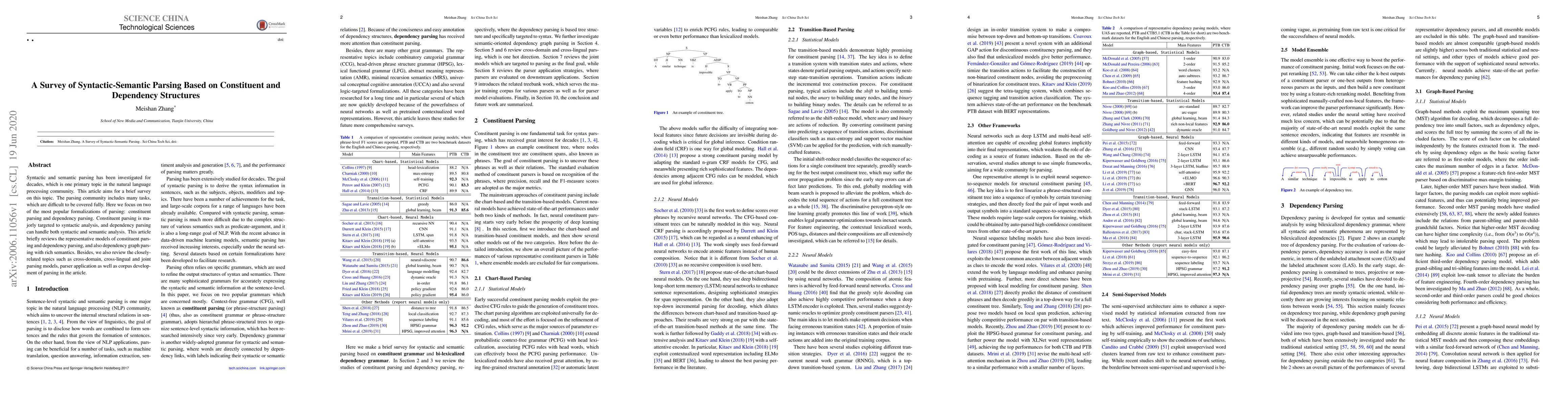This paper provides a concise survey of syntactic-semantic parsing, focusing on constituent and dependency parsing methods. It reviews key models for both parsing types and also examines related cross-domain, cross-lingual, and joint parsing efforts along with parser applications and corpus development.