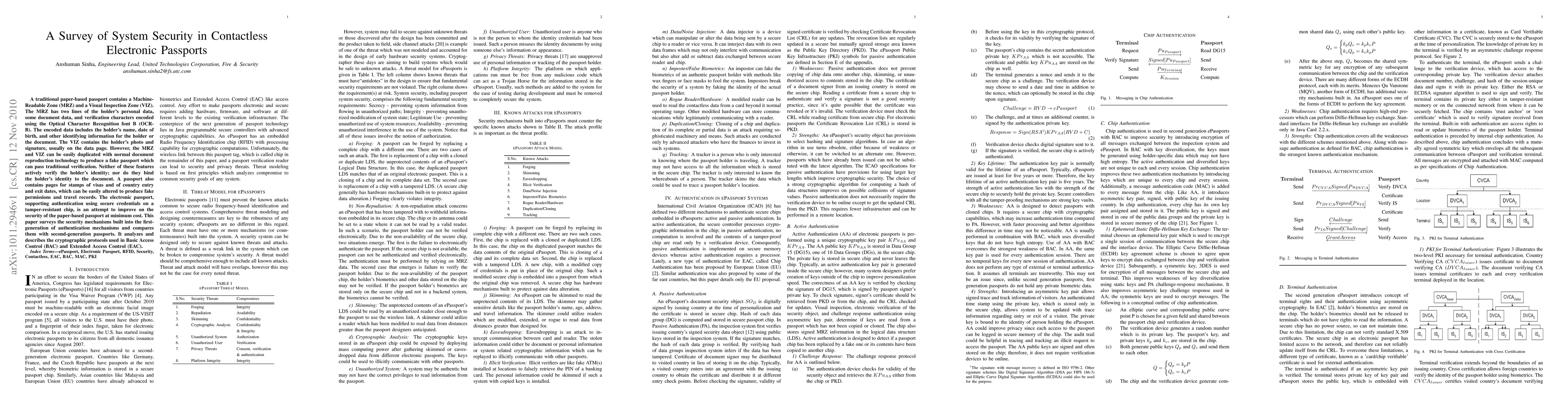 A traditional paper-based passport contains a Machine- Readable Zone (MRZ) and a Visual Inspection Zone (VIZ). The MRZ has two lines of the holder's personal data, some document data, and verification characters encoded using the Optical Character Recognition font B (OCRB). The encoded data includes the holder's name, date of birth, and other identifying information for the holder or the document. The VIZ contains the holder's photo and signature, usually on the data page. However, the MRZ and VIZ can be easily duplicated with normal document reproduction technology to produce a fake passport which can pass traditional verification. Neither of these features actively verify the holder's identity; nor do they bind the holder's identity to the document. A passport also contains pages for stamps of visas and of country entry and exit dates, which can be easily altered to produce fake permissions and travel records. The electronic passport, supporting authentication using secure credentials on a tamper-resistant chip, is an attempt to improve on the security of the paper-based passport at minimum cost. This paper surveys the security mechanisms built into the firstgeneration of authentication mechanisms and compares them with second-generation passports. It analyzes and describes the cryptographic protocols used in Basic Access Control (BAC) and Extended Access Control (EAC).