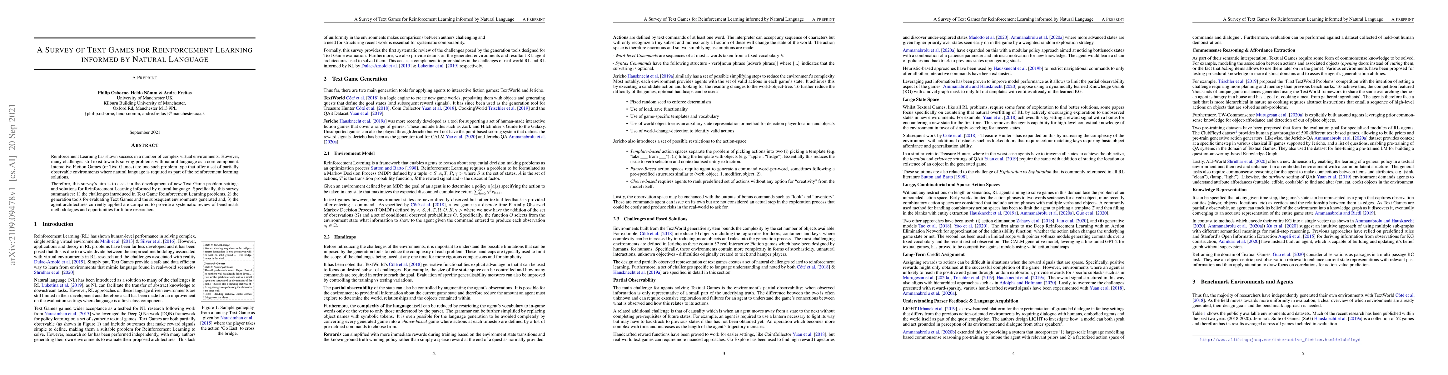 This survey explores challenges in Text Game Reinforcement Learning, summarizing tools for evaluating Text Games and comparing agent architectures to inform future research and development in the field. It aims to highlight methodologies and opportunities for new Text Game problem settings.
