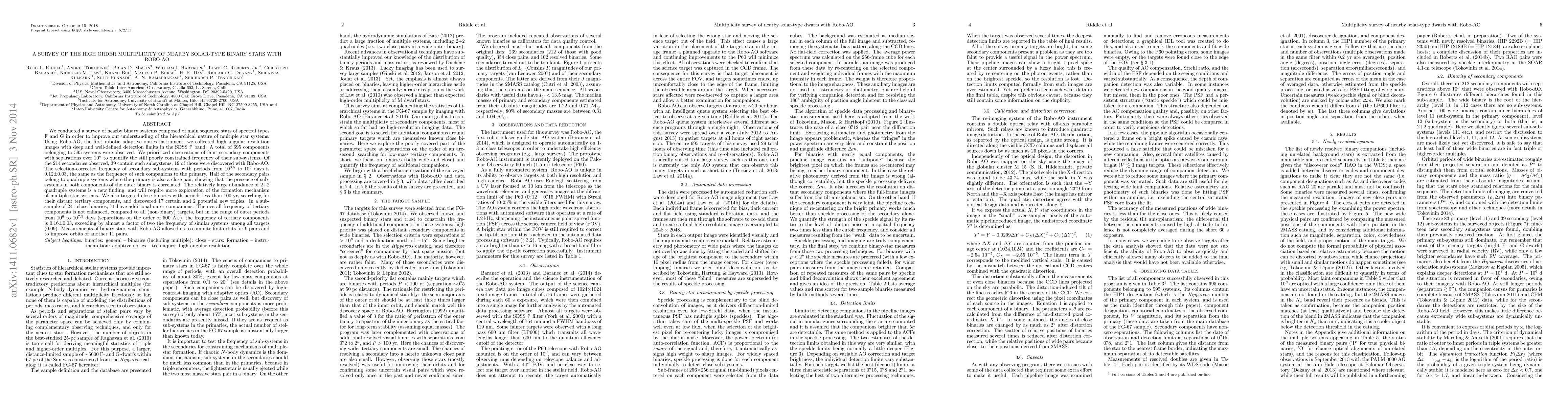 A survey of nearby solar-type binary stars used Robo-AO to detect 19 sub-systems in secondary components, with a frequency of 0.12, similar to companion frequencies. The study also found a higher frequency of tertiary components at long outer periods.
