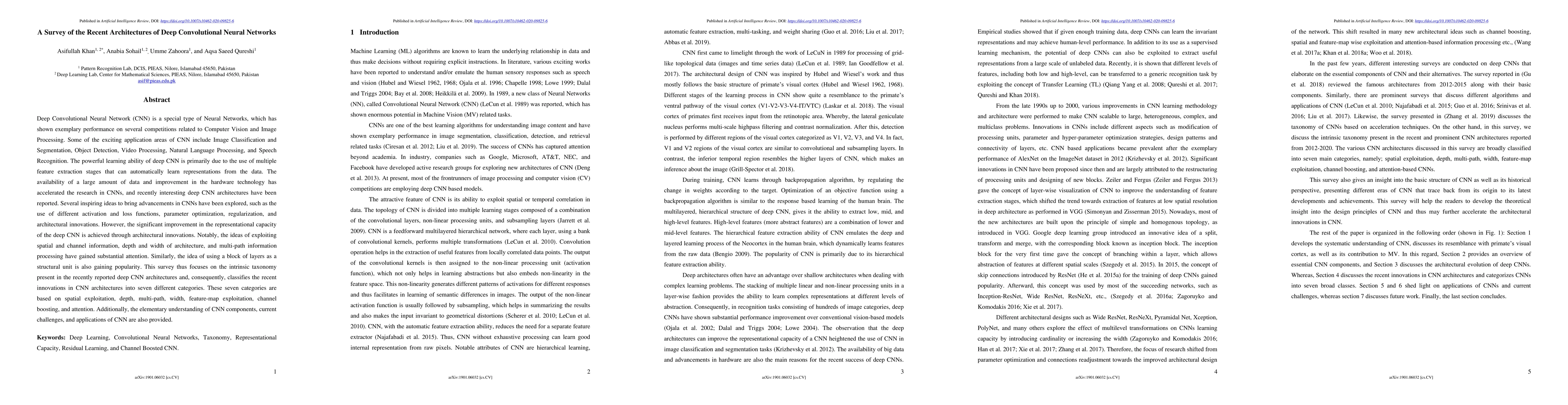 This paper surveys recent advancements in Deep Convolutional Neural Networks (CNNs), highlighting seven key architectural innovations: spatial exploitation, depth, multi-path, width, feature-map exploitation, channel boosting, and attention. It discusses the intrinsic taxonomy of these innovations and provides an overview of CNN components, current challenges, and applications. For detailed insights, the original paper should be consulted directly.