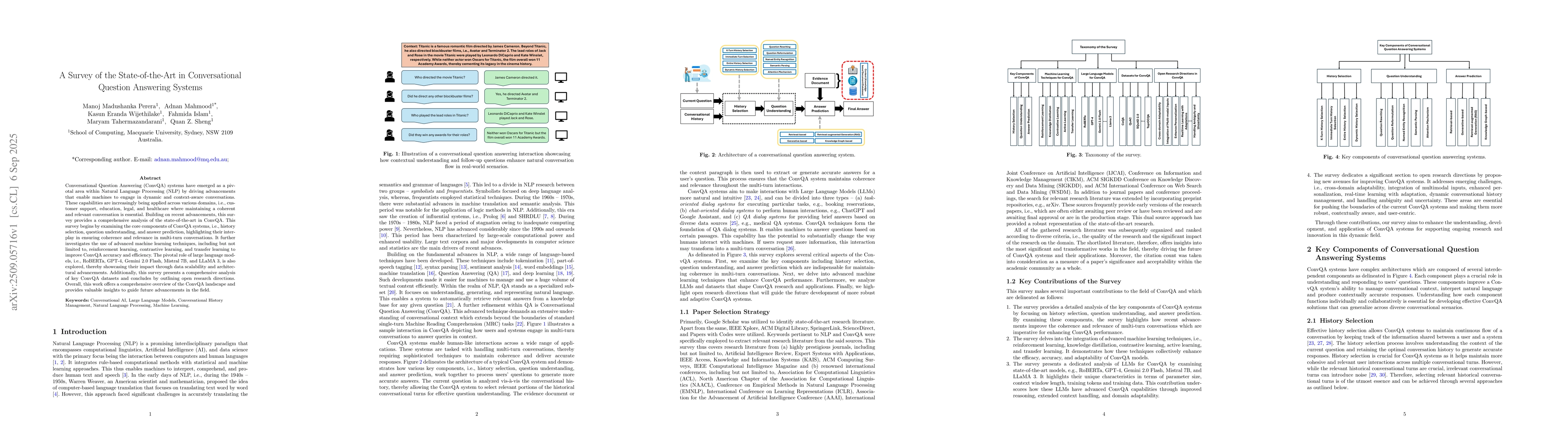 Conversational Question Answering (ConvQA) systems have emerged as a pivotal area within Natural Language Processing (NLP) by driving advancements that enable machines to engage in dynamic and context-aware conversations. These capabilities are increasingly being applied across various domains, i.e., customer support, education, legal, and healthcare where maintaining a coherent and relevant conversation is essential. Building on recent advancements, this survey provides a comprehensive analysis of the state-of-the-art in ConvQA. This survey begins by examining the core components of ConvQA systems, i.e., history selection, question understanding, and answer prediction, highlighting their interplay in ensuring coherence and relevance in multi-turn conversations. It further investigates the use of advanced machine learning techniques, including but not limited to, reinforcement learning, contrastive learning, and transfer learning to improve ConvQA accuracy and efficiency. The pivotal role of large language models, i.e., RoBERTa, GPT-4, Gemini 2.0 Flash, Mistral 7B, and LLaMA 3, is also explored, thereby showcasing their impact through data scalability and architectural advancements. Additionally, this survey presents a comprehensive analysis of key ConvQA datasets and concludes by outlining open research directions. Overall, this work offers a comprehensive overview of the ConvQA landscape and provides valuable insights to guide future advancements in the field.