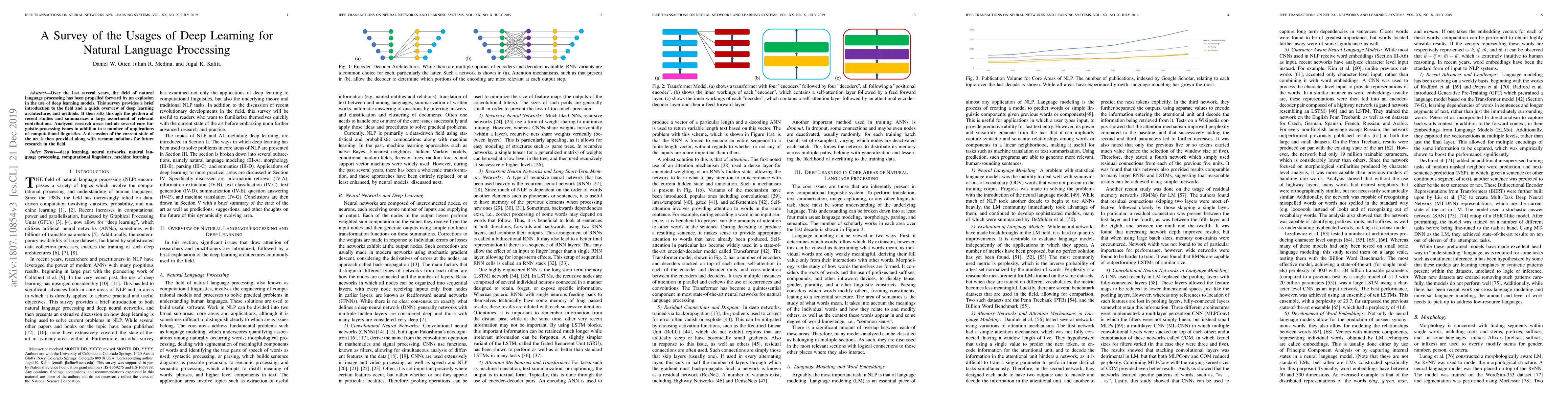 This paper surveys the extensive use of deep learning in natural language processing, summarizing key architectures and methods, and analyzing recent studies across core linguistic tasks and computational linguistics applications. It discusses the current state of the art and suggests future research directions.