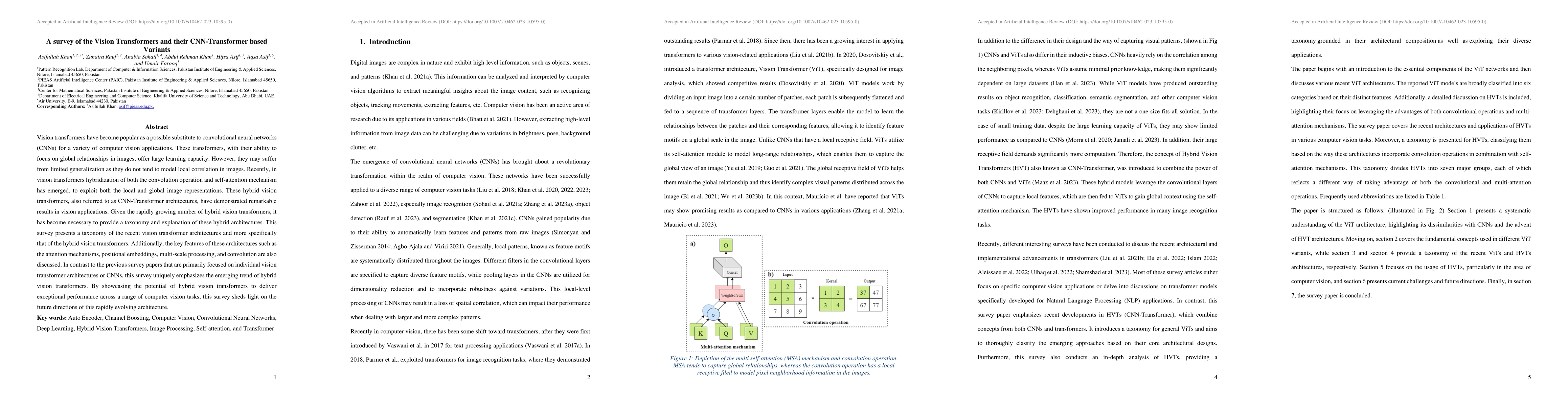 This survey categorizes recent vision transformer architectures, with a particular focus on hybrid CNN-Transformer models that leverage both local and global image representations. It highlights the key features and potential of these hybrid architectures in achieving superior performance across various computer vision tasks.
