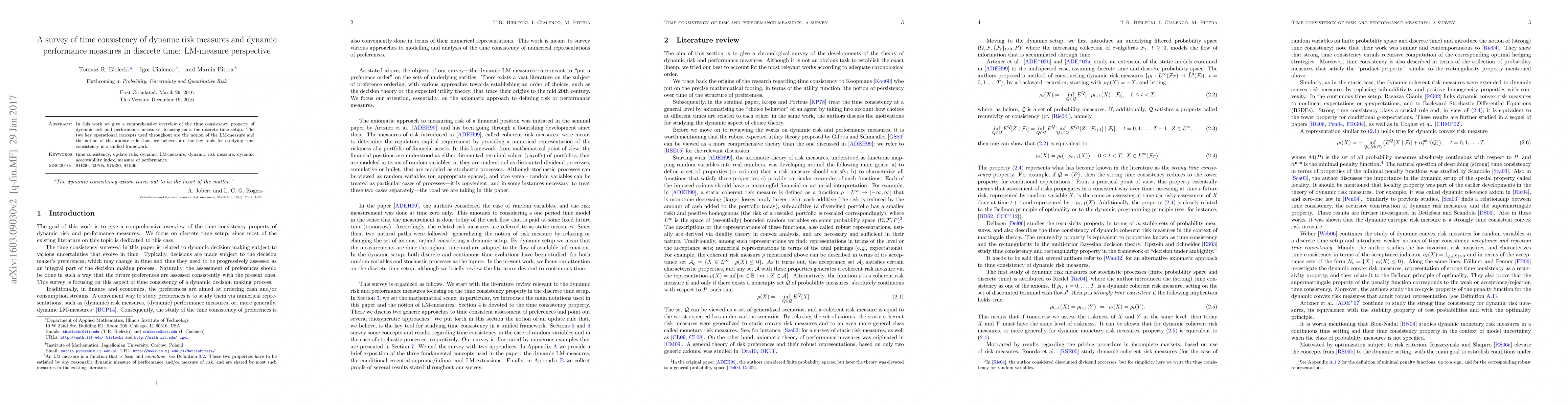 This paper provides a detailed survey on the time consistency of dynamic risk and performance measures in discrete time, emphasizing the LM-measure and update rule as essential tools for a unified study of these concepts.