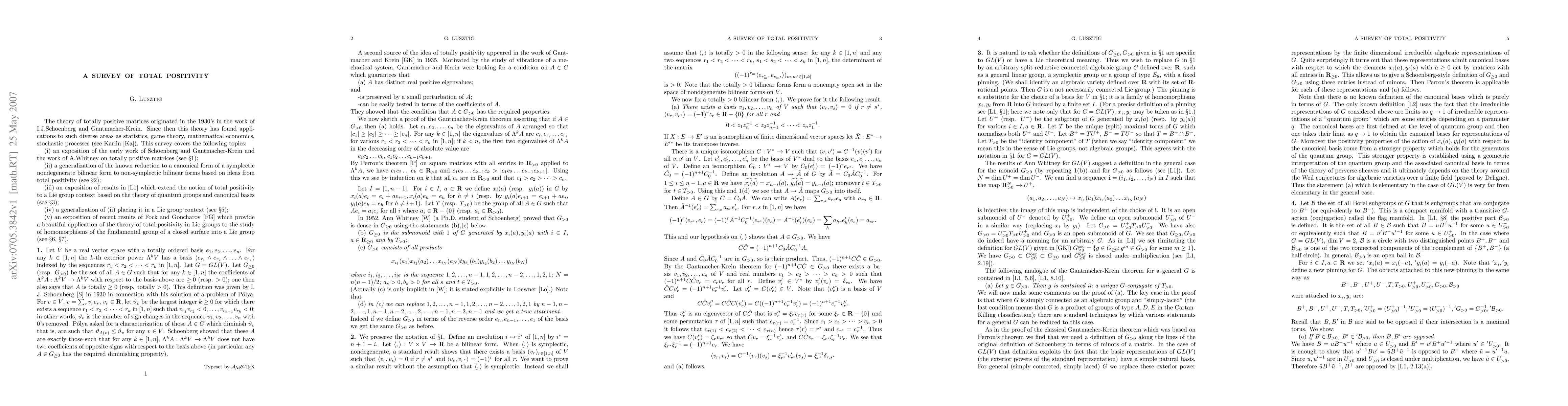 This paper surveys the history and generalization of totally positive matrices and their application to Lie groups, detailing a method to reduce bilinear forms to canonical forms using total positivity, and discusses results on homomorphisms of the fundamental group of a closed surface into a Lie group by Fock and Goncharov.
