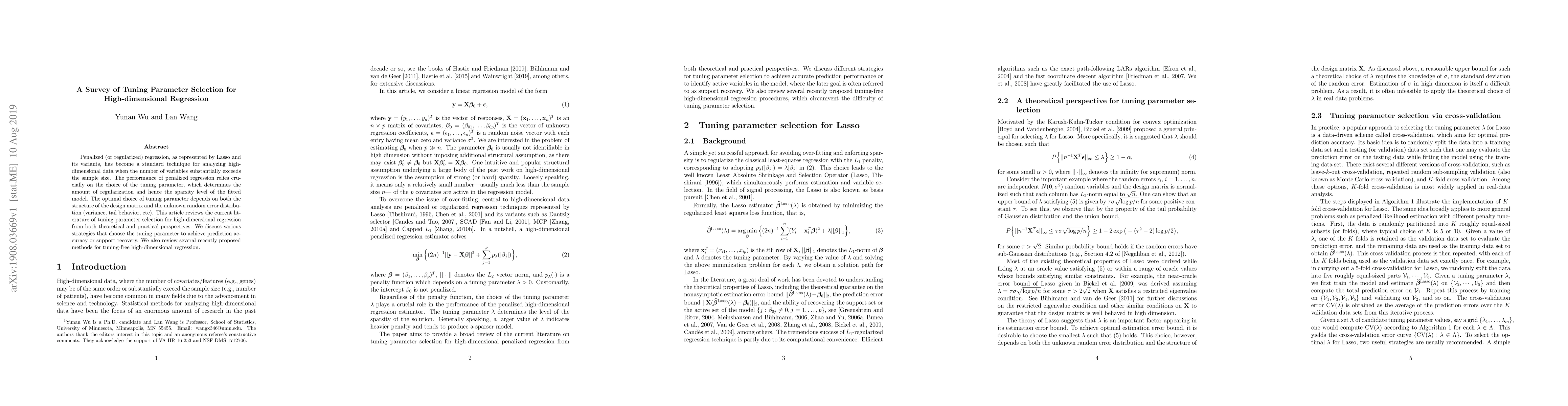 Penalized (or regularized) regression, as represented by Lasso and its variants, has become a standard technique for analyzing high-dimensional data when the number of variables substantially exceeds the sample size. The performance of penalized regression relies crucially on the choice of the tuning parameter, which determines the amount of regularization and hence the sparsity level of the fitted model. The optimal choice of tuning parameter depends on both the structure of the design matrix and the unknown random error distribution (variance, tail behavior, etc). This article reviews the current literature of tuning parameter selection for high-dimensional regression from both theoretical and practical perspectives. We discuss various strategies that choose the tuning parameter to achieve prediction accuracy or support recovery. We also review several recently proposed methods for tuning-free high-dimensional regression.