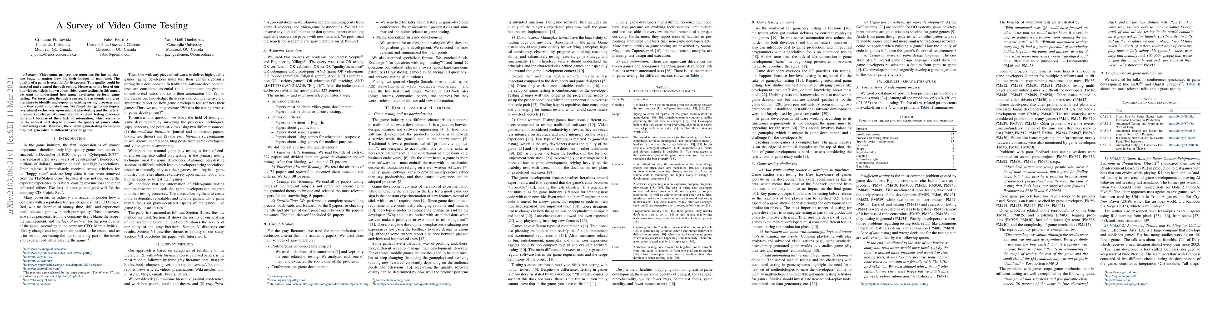 This paper surveys existing video game testing practices, revealing that developers predominantly use manual play-testing. It concludes that current processes lack automation, which could enhance game quality while controlling costs, though these methods may not be universally applicable across different game genres.