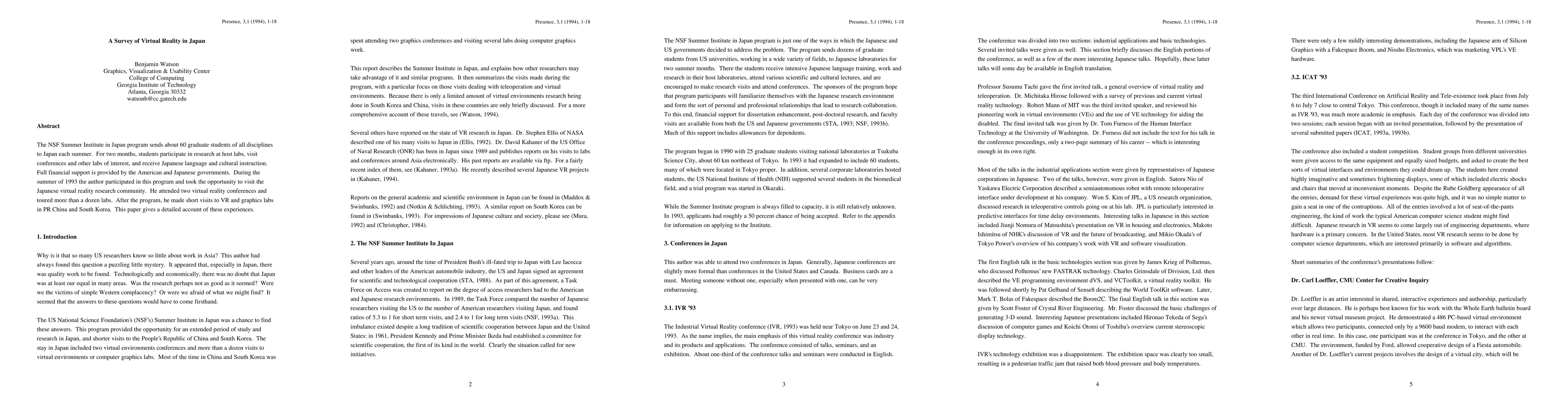The NSF Summer Institute in Japan program sends about 60 graduate students of all disciplines to Japan each summer. For two months, students participate in research at host labs, visit conferences and other labs of interest, and receive Japanese language and cultural instruction. Full financial support is provided by the American and Japanese governments. During the summer of 1993, the author participated in this program and took the opportunity to visit the Japanese virtual reality research community. He attended two virtual reality conferences and toured more than a dozen labs. After the program, he made short visits to VR and graphics labs in PR China and South Korea. This paper gives a detailed account of these experiences.