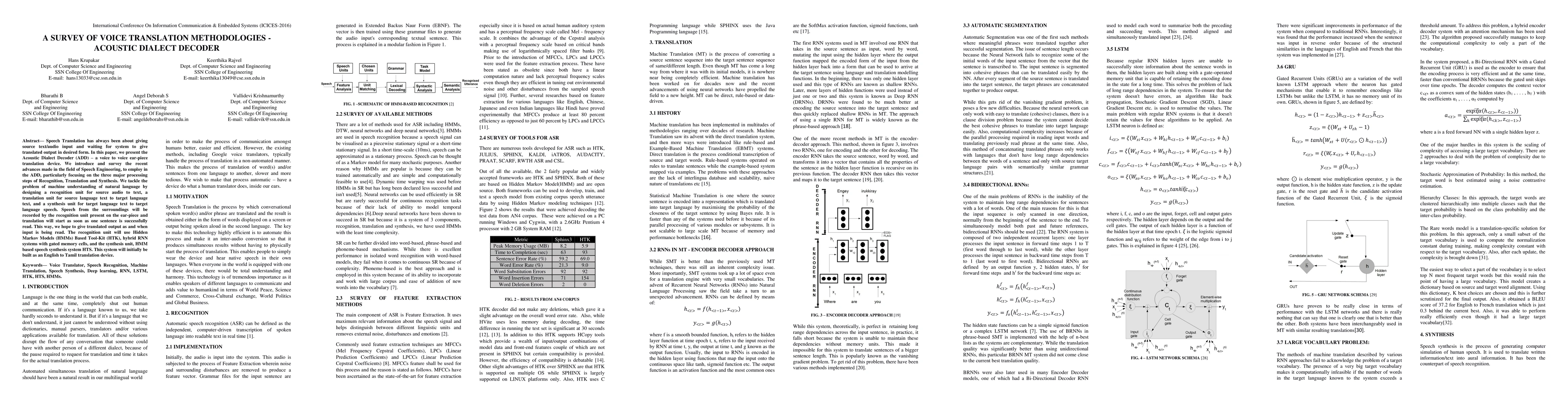 Speech Translation has always been about giving source text or audio input and waiting for system to give translated output in desired form. In this paper, we present the Acoustic Dialect Decoder (ADD) - a voice to voice ear-piece translation device. We introduce and survey the recent advances made in the field of Speech Engineering, to employ in the ADD, particularly focusing on the three major processing steps of Recognition, Translation and Synthesis. We tackle the problem of machine understanding of natural language by designing a recognition unit for source audio to text, a translation unit for source language text to target language text, and a synthesis unit for target language text to target language speech. Speech from the surroundings will be recorded by the recognition unit present on the ear-piece and translation will start as soon as one sentence is successfully read. This way, we hope to give translated output as and when input is being read. The recognition unit will use Hidden Markov Models (HMMs) Based Tool-Kit (HTK), hybrid RNN systems with gated memory cells, and the synthesis unit, HMM based speech synthesis system HTS. This system will initially be built as an English to Tamil translation device.