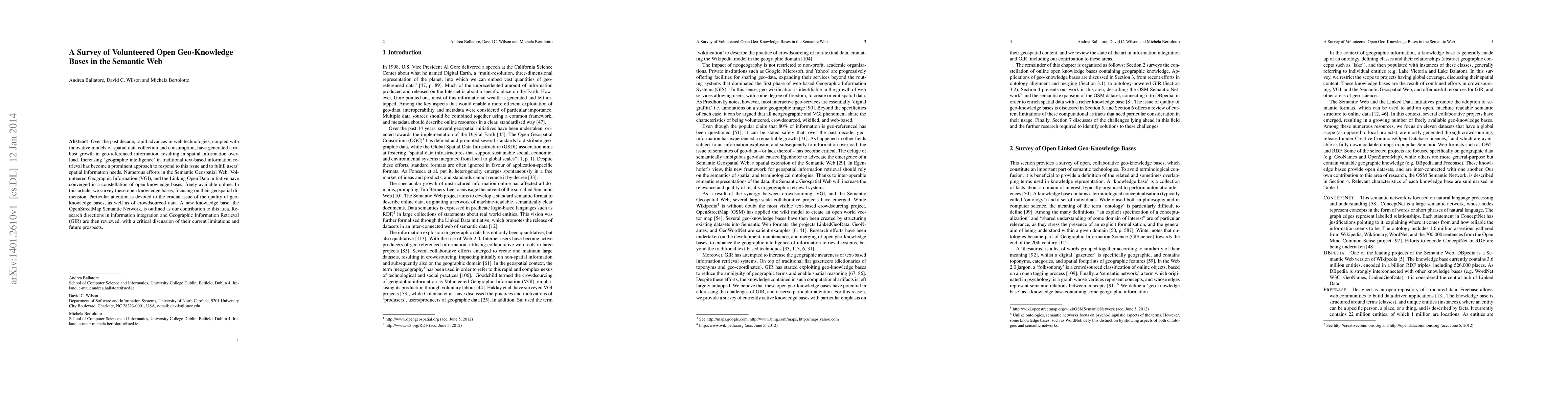 This paper surveys open geo-knowledge bases in the Semantic Web, emphasizing their geospatial dimension and quality issues. It highlights OpenStreetMap Semantic Network as a new contribution and discusses current limitations and future prospects in information integration and Geographic Information Retrieval.