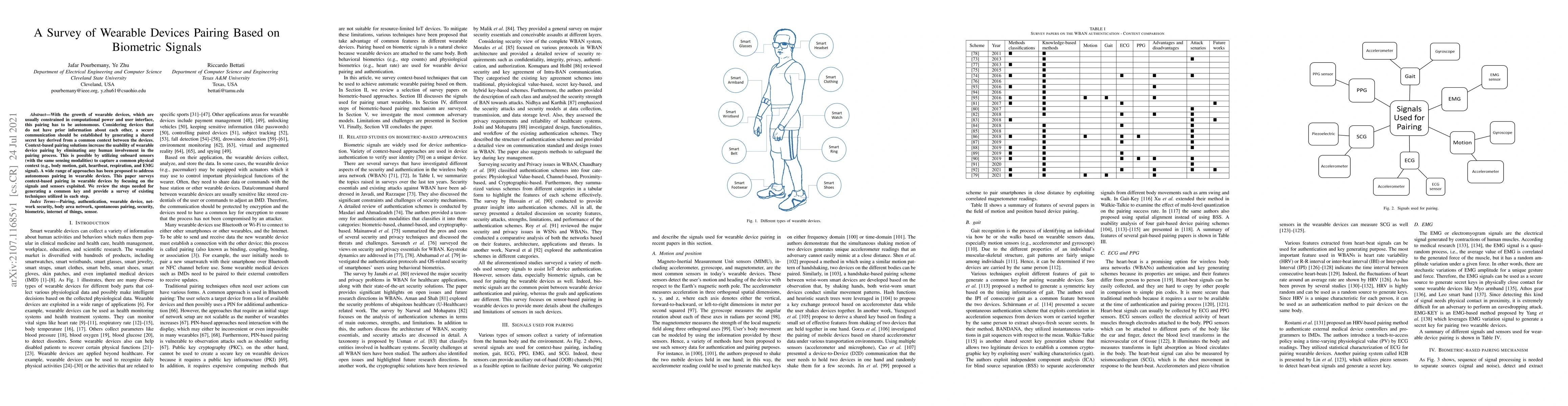 This paper surveys context-based pairing methods for wearable devices, emphasizing the use of biometric signals and onboard sensors for autonomous, secure communication without human intervention. It reviews techniques for generating shared secret keys through common physical contexts and provides an overview of existing pairing approaches.