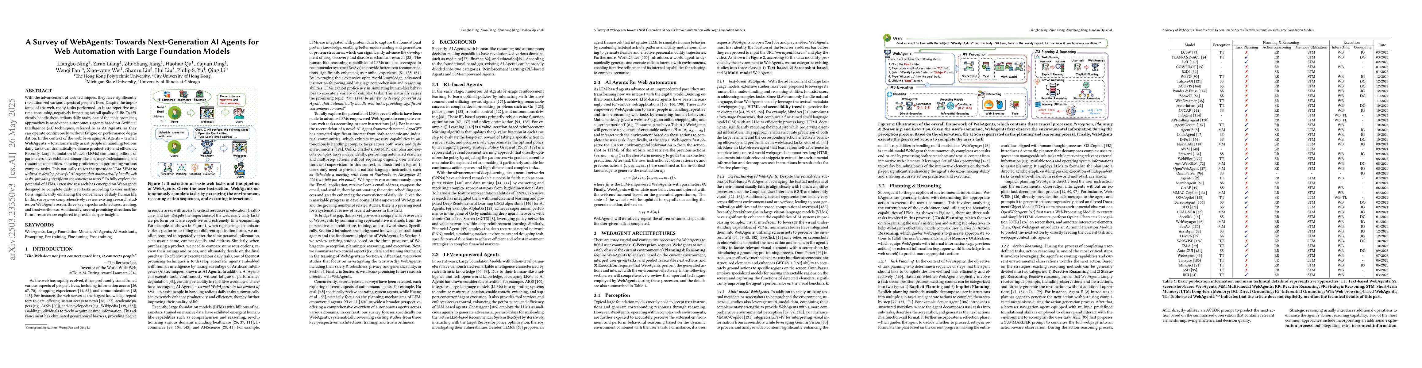 This survey reviews existing research on WebAgents, AI agents that automate tedious web tasks using Large Foundation Models, aiming to enhance productivity and efficiency in daily life. It explores key aspects of WebAgent architectures, training, and trustworthiness for future research directions.