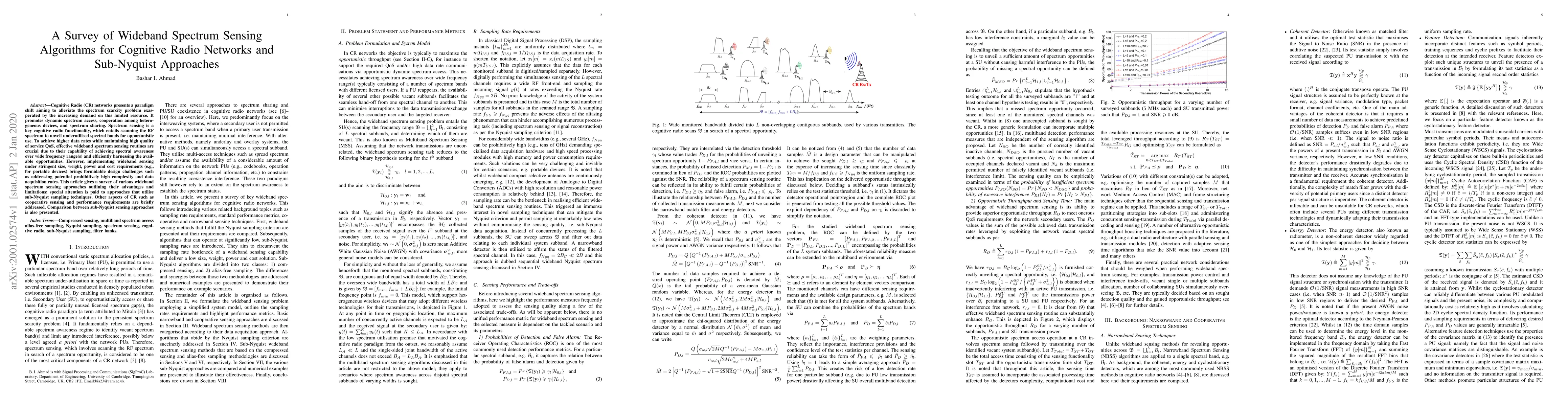 Cognitive Radio (CR) networks presents a paradigm shift aiming to alleviate the spectrum scarcity problem exasperated by the increasing demand on this limited resource. It promotes dynamic spectrum access, cooperation among heterogeneous devices, and spectrum sharing. Spectrum sensing is a key cognitive radio functionality, which entails scanning the RF spectrum to unveil underutilised spectral bands for opportunistic use. To achieve higher data rates while maintaining high quality of service QoS, effective wideband spectrum sensing routines are crucial due to their capability of achieving spectral awareness over wide frequency range(s)\ and efficiently harnessing the available opportunities. However, implementing wideband sensing under stringent size, weight, power and cost requirements (e.g., for portable devices) brings formidable design challenges such as addressing potential prohibitively high complexity and data acquisition rates. This article gives a survey of various wideband spectrum sensing approaches outlining their advantages and limitations; special attention is paid to approaches that utilise sub-Nyquist sampling techniques. Other aspects of CR such as cooperative sensing and performance requirements are briefly addressed. Comparison between sub-Nyquist sensing approaches is also presented.