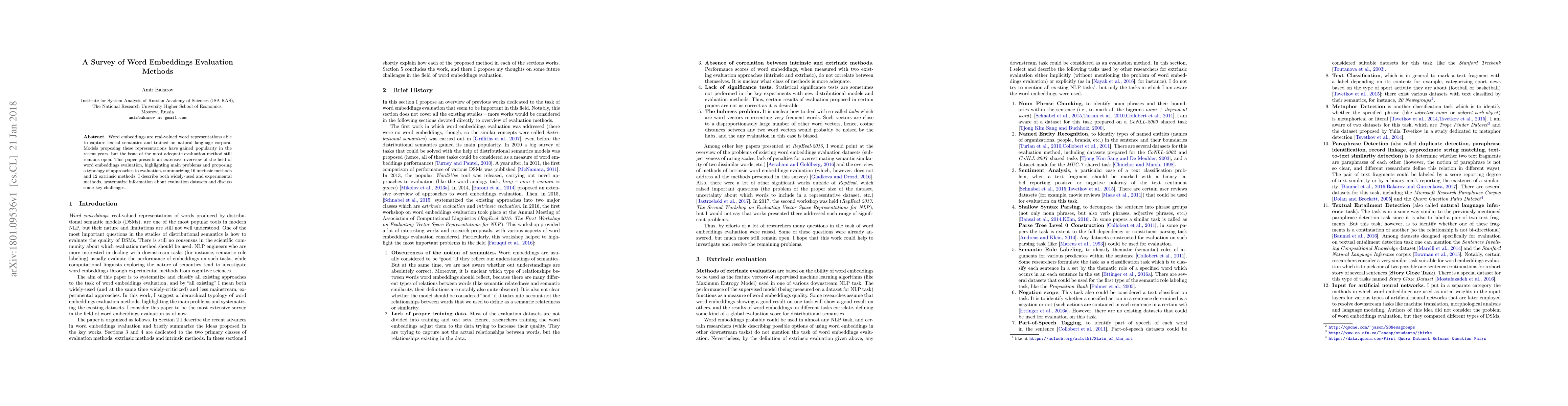 Word embeddings are real-valued word representations able to capture lexical semantics and trained on natural language corpora. Models proposing these representations have gained popularity in the recent years, but the issue of the most adequate evaluation method still remains open. This paper presents an extensive overview of the field of word embeddings evaluation, highlighting main problems and proposing a typology of approaches to evaluation, summarizing 16 intrinsic methods and 12 extrinsic methods. I describe both widely-used and experimental methods, systematize information about evaluation datasets and discuss some key challenges.