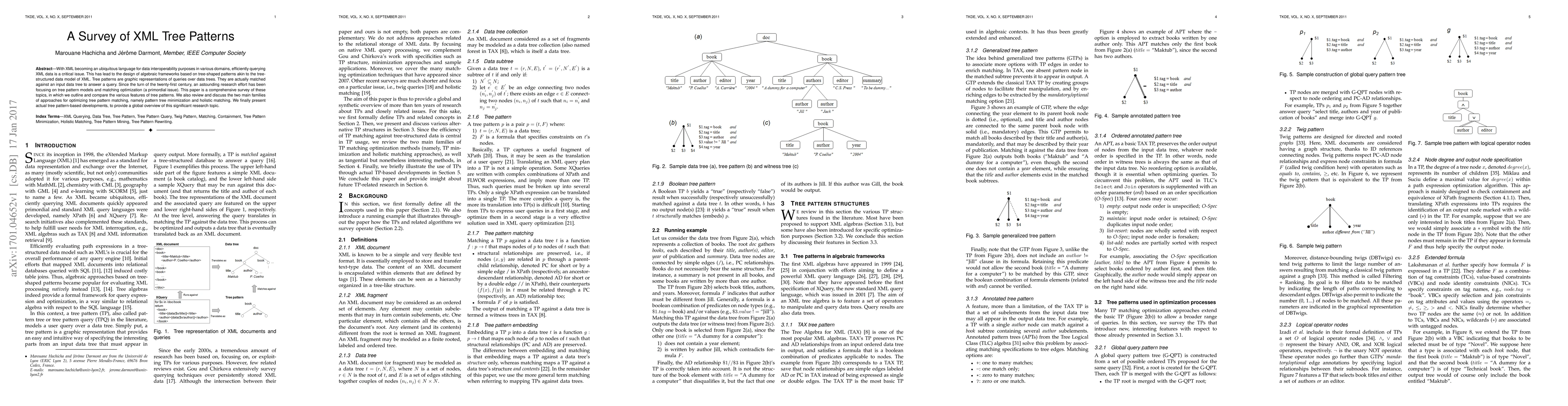 This paper surveys tree patterns used in XML data querying, comparing their features and reviewing optimization approaches like pattern tree minimization and holistic matching. It also highlights significant developments in this research area.