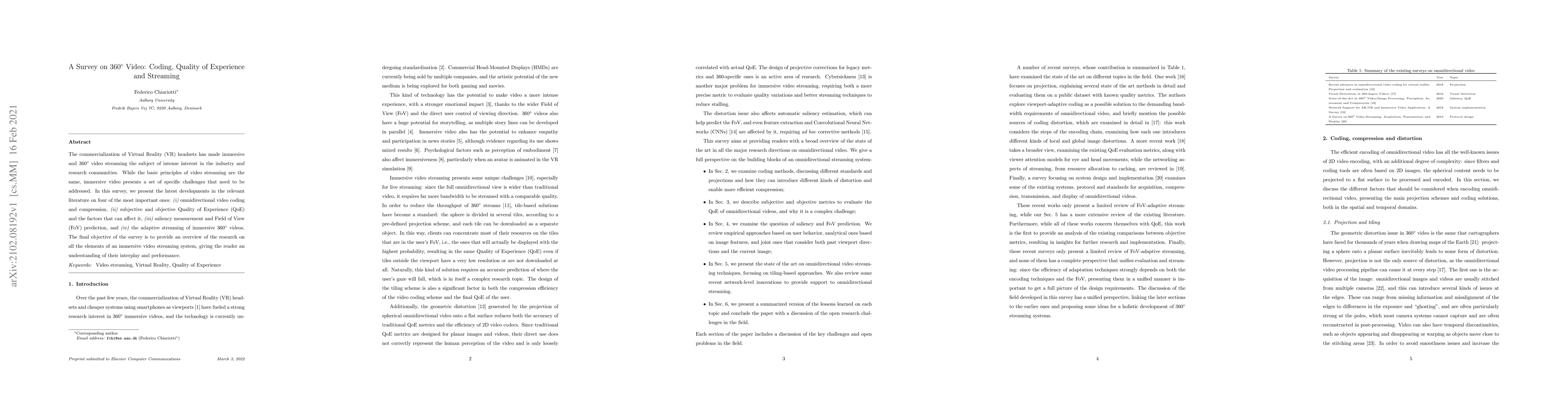This survey reviews advancements in 360-degree video streaming, focusing on coding and compression techniques, Quality of Experience factors, saliency measurement, and adaptive streaming strategies to address the unique challenges of immersive video. The aim is to provide a comprehensive overview of the components and their interplay in an immersive video streaming system.