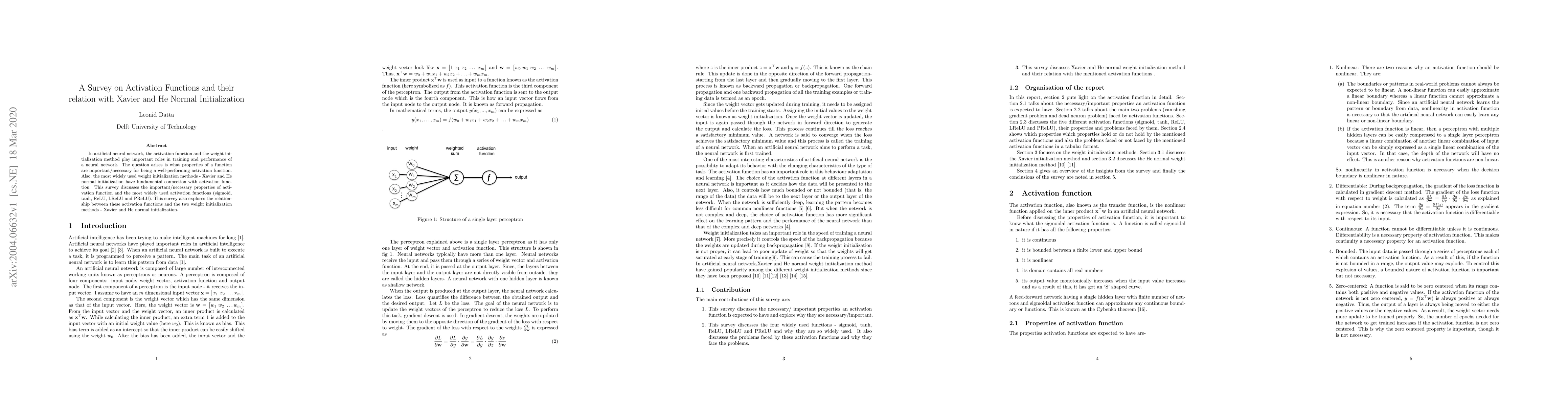 This survey investigates the essential properties of activation functions in neural networks and examines the most commonly used activation functions, including sigmoid, tanh, ReLU, LReLU, and PReLU. It also explores the connections between these functions and the widely used weight initialization methods, Xavier and He normal initialization.