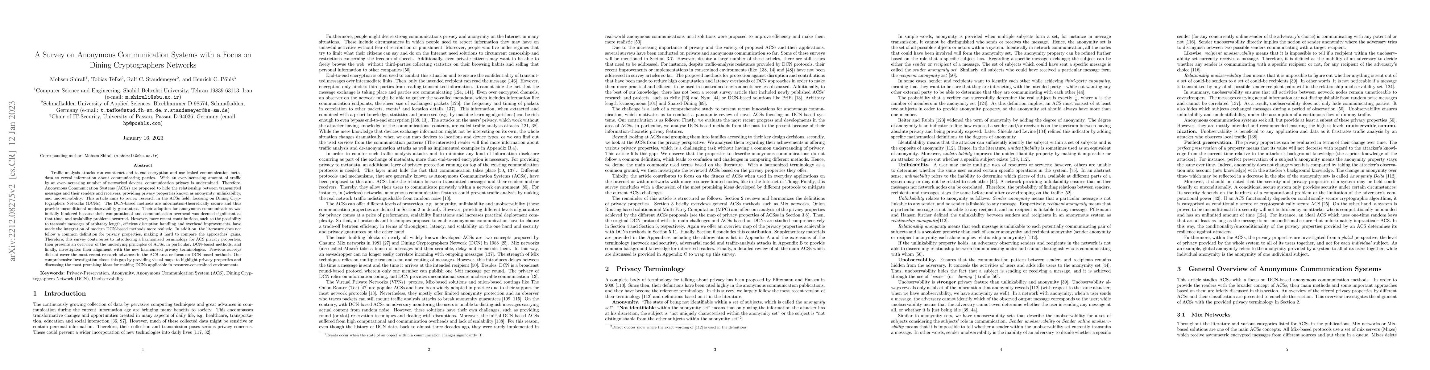 This paper surveys Anonymous Communication Systems (ACSs), emphasizing Dining Cryptographers Networks (DCNs) for enhanced privacy. It introduces a harmonized terminology for privacy properties, reviews recent advances in DCN-based methods, and discusses their scalability and applicability in resource-constrained environments.