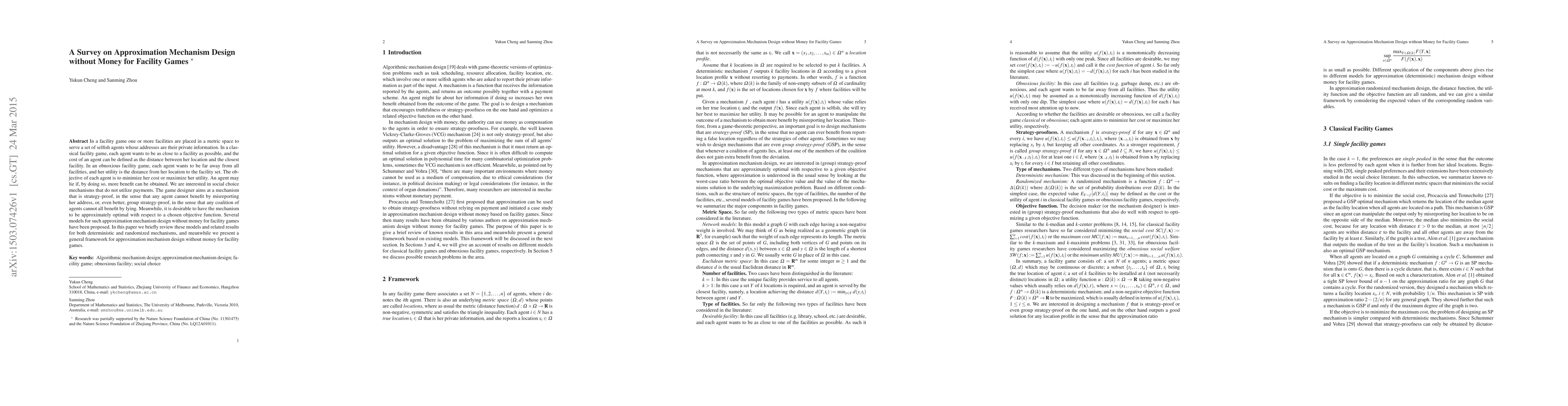 This paper proposes a general framework for designing approximation mechanisms without money in facility games, aiming to balance strategy-proofness with optimality, and reviews existing models for deterministic and randomized mechanisms.