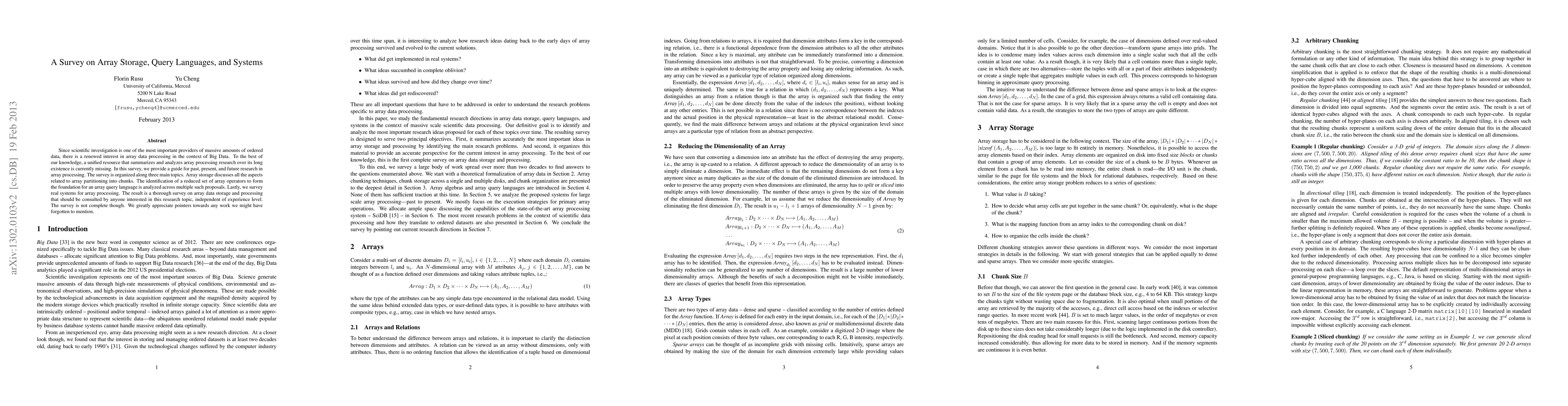 This survey provides a comprehensive guide to array data processing in Big Data, covering storage, query languages, and systems, highlighting the key aspects of past, present, and future research in the field.