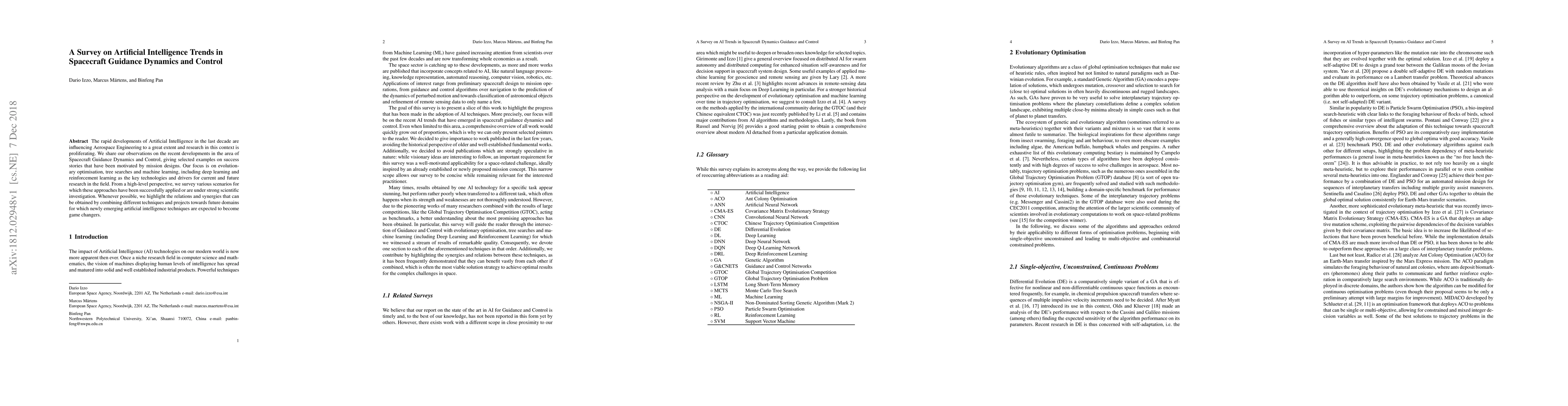 This paper surveys recent advancements in Artificial Intelligence for spacecraft guidance, dynamics, and control, emphasizing evolutionary optimization, tree searches, and machine learning, including deep and reinforcement learning. It highlights successful applications and future research directions, noting synergies between different AI techniques.
