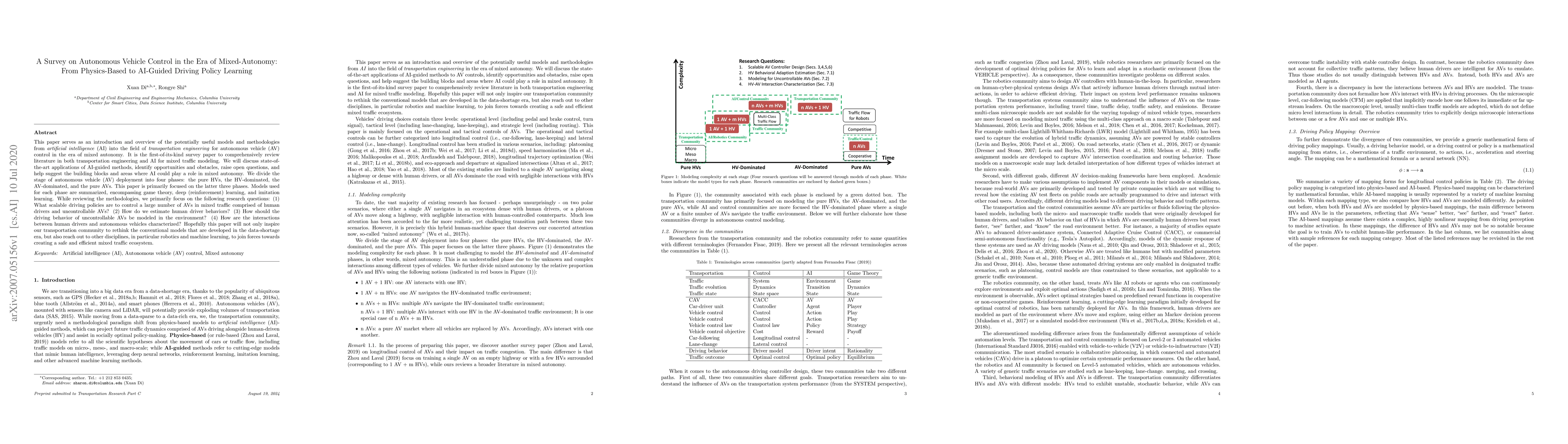 This paper surveys AI-guided methodologies for autonomous vehicle control in mixed-autonomy scenarios, focusing on scalable driving policies, human driver behavior estimation, and interactions in mixed traffic. It categorizes AV deployment phases and highlights opportunities and challenges for integrating AI in transportation engineering.
