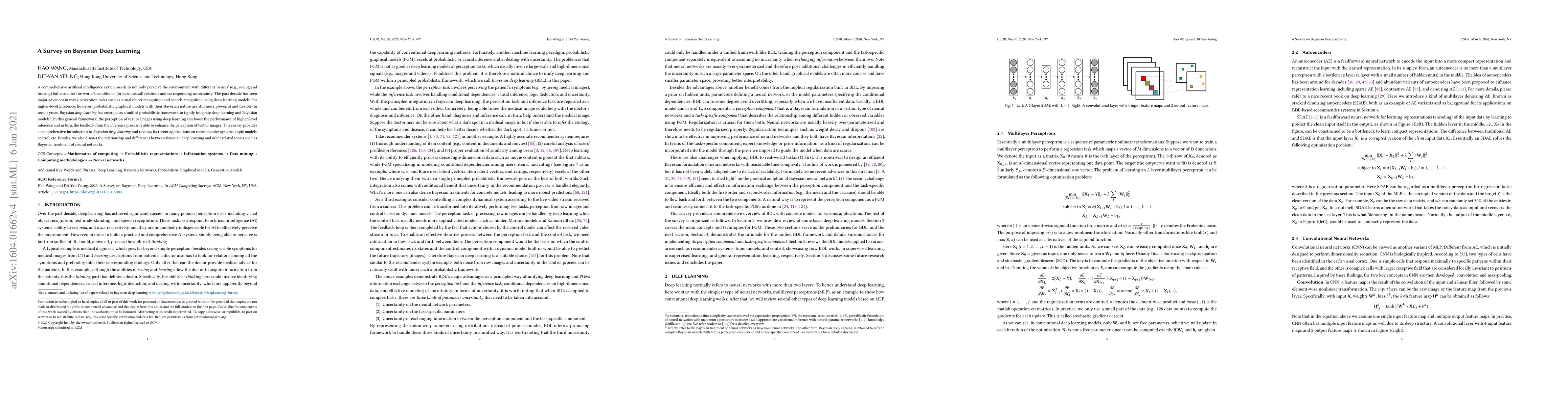 This paper surveys Bayesian deep learning, a framework that integrates deep learning and Bayesian probabilistic models to enhance perception and higher-level inference. It reviews recent applications in recommender systems, topic models, and control, and discusses its distinctions from other related approaches.