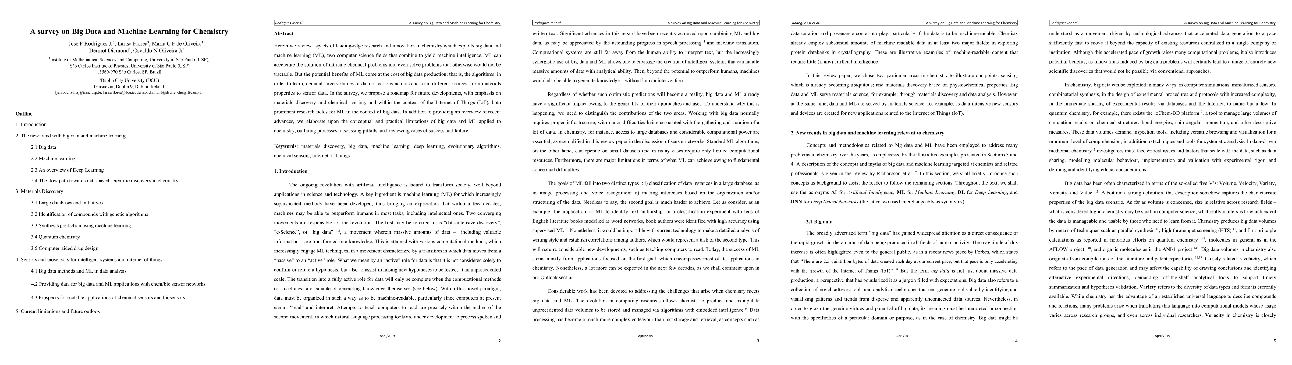 This survey explores the intersection of big data and machine learning in chemistry, highlighting its potential benefits and limitations for materials discovery and chemical sensing. It proposes a roadmap for future developments and reviews recent advances, pitfalls, and successes in applying big data and ML to solve intricate chemical problems.